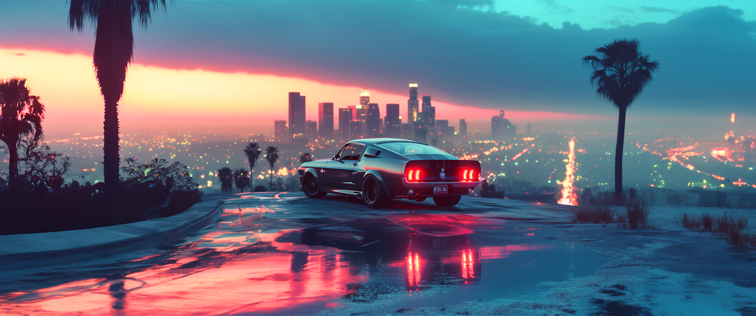 Twilight Cityscape with Classic Mustang