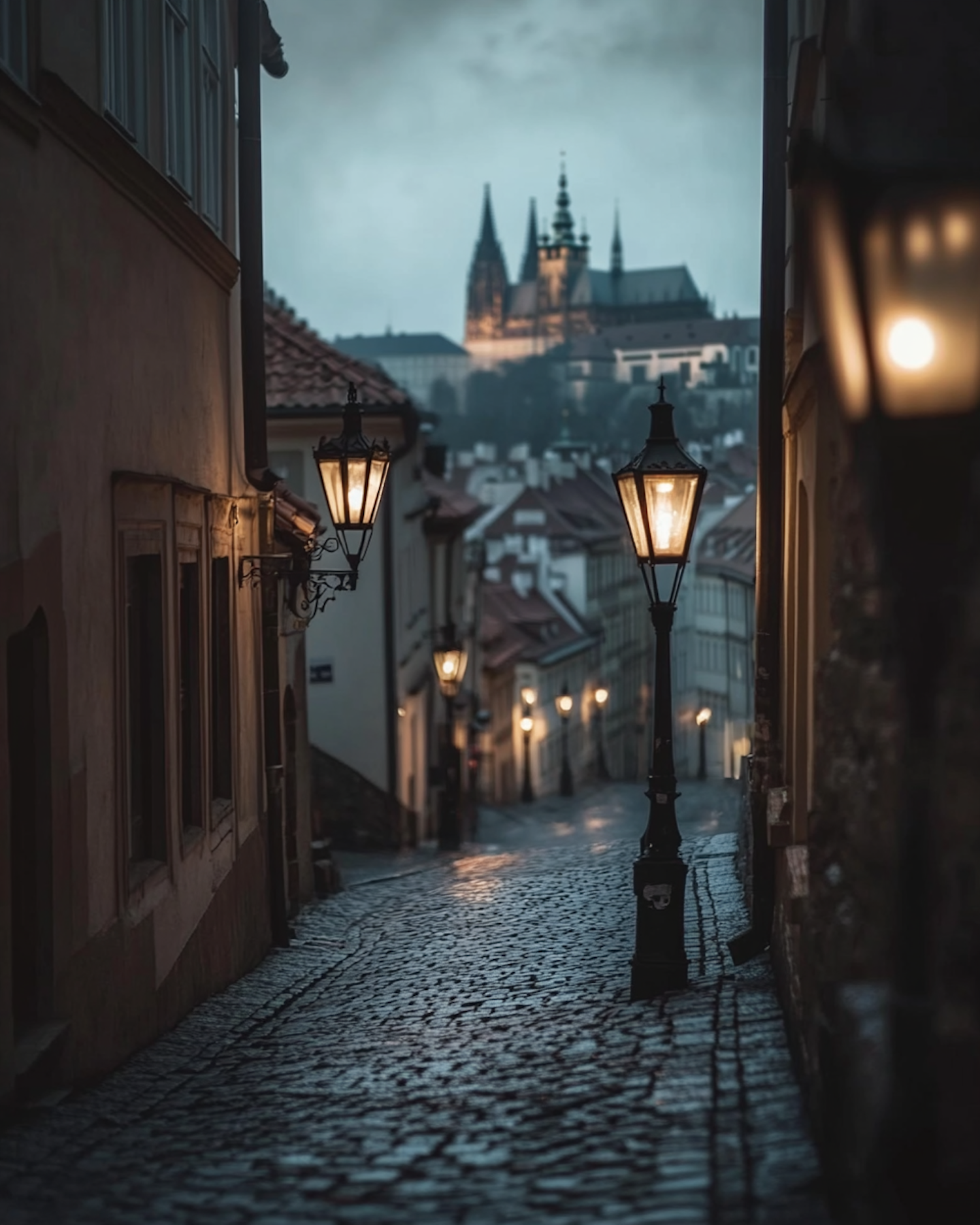 Charming cobblestone street with vintage lamps leading to a majestic castle under a dusky sky, evoking history and romance.