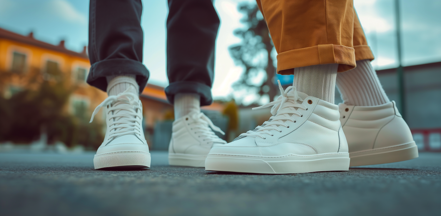 Stylish white high-top sneakers paired with dark and mustard pants, set against an urban backdrop. Trendy and modern footwear fashion.