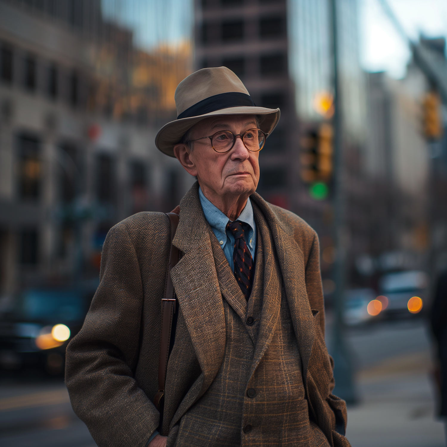 Elderly man in a beige fedora and tweed suit stands on a city street, exuding vintage charm against a blurred urban backdrop.