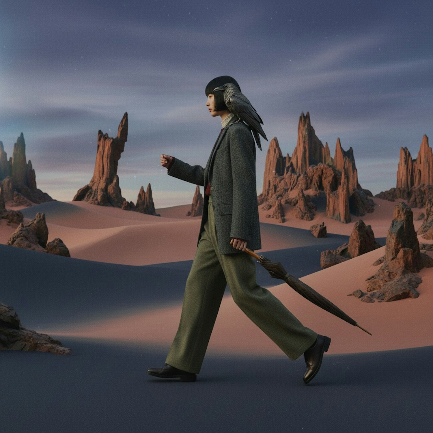 A person in a surreal desert with a bird on their shoulder, wearing a tailored outfit and holding an umbrella, surrounded by rock formations.