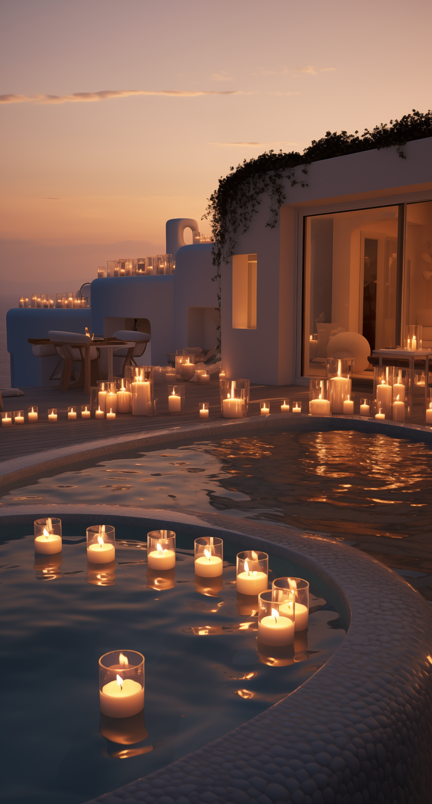 Luxurious poolside with floating candles at sunset, creating a romantic and serene atmosphere.