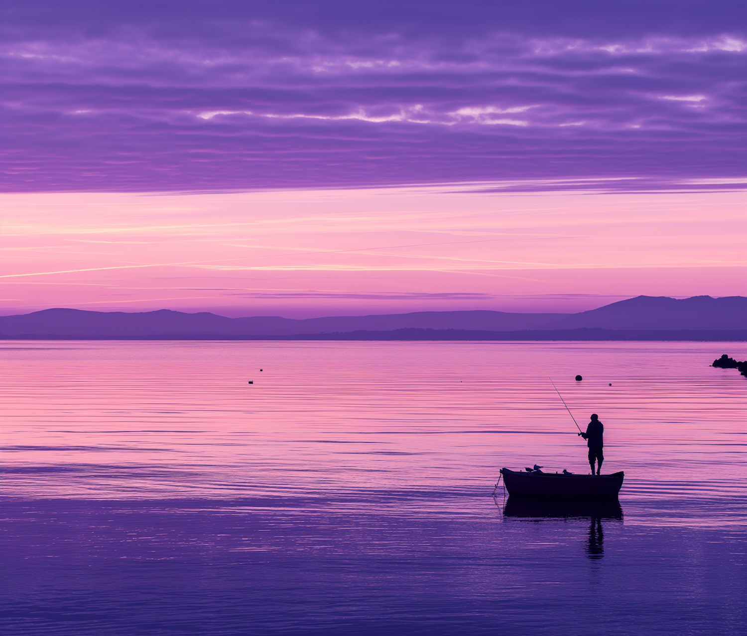 Silhouette of a fisherman on a boat at sunset with purple and pink skies reflecting on calm water, creating a serene and tranquil scene.