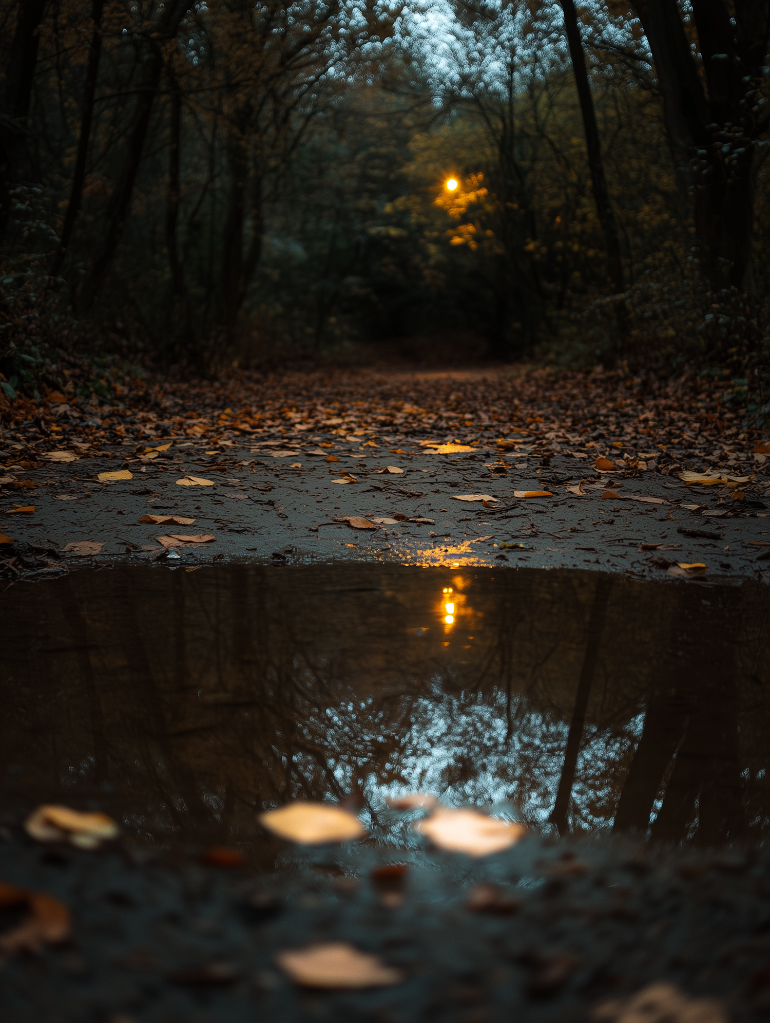 A tranquil forest path at twilight with autumn leaves, a glowing streetlamp, and a reflective puddle creating a serene atmosphere.
