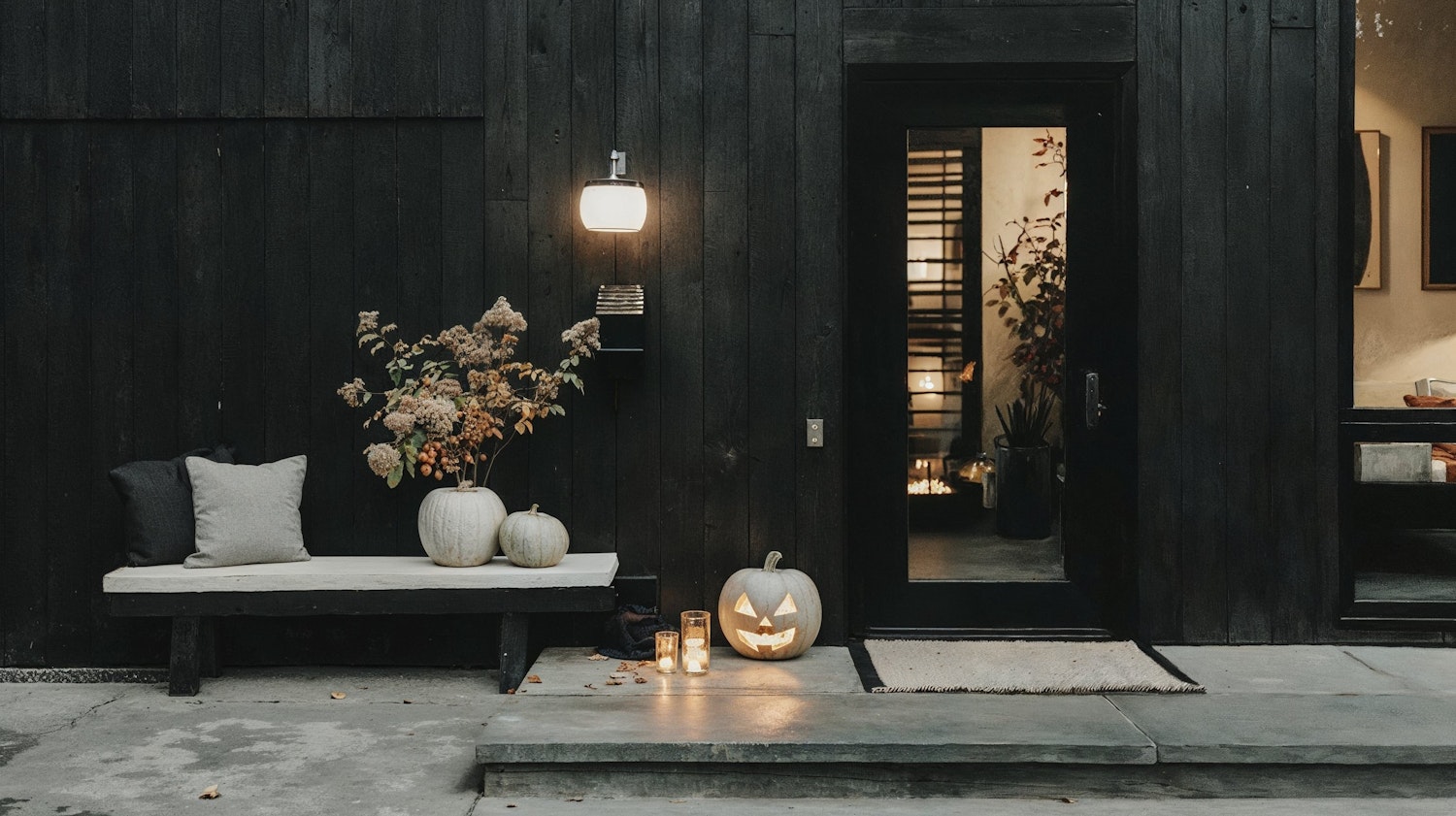 Cozy outdoor scene with pumpkins, candles, and a dark wooden exterior, creating a warm, inviting atmosphere.