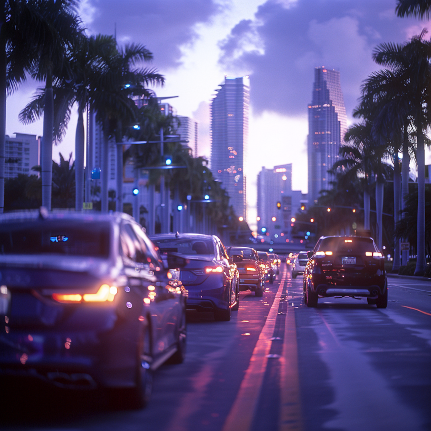 City street at dusk with traffic, palm trees, and skyscrapers under a purple-pink sky, capturing urban energy and tropical vibes.