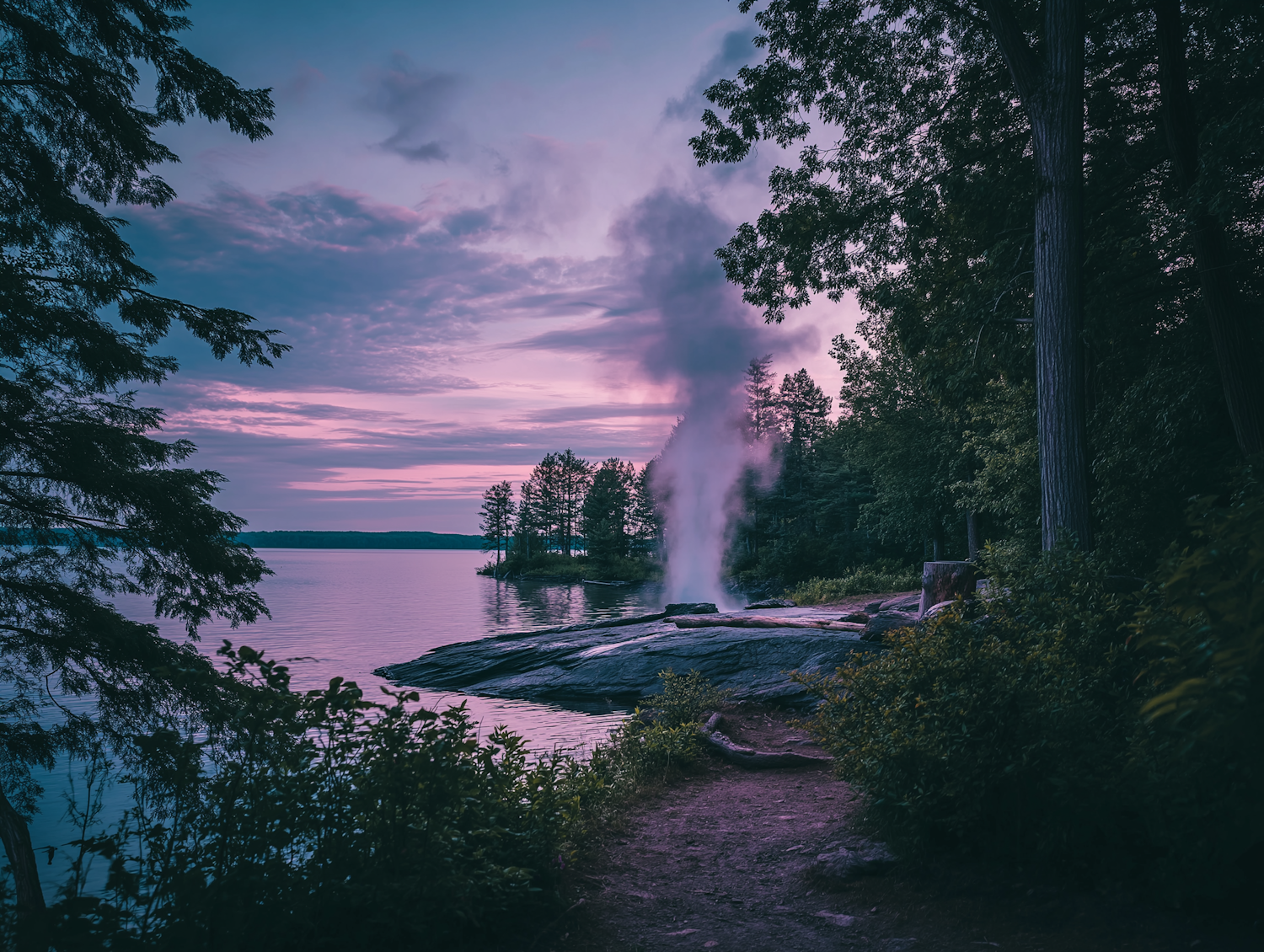 Twilight by a forested lakeshore geyser, colorful skies reflecting in the water, and serene natural surroundings.