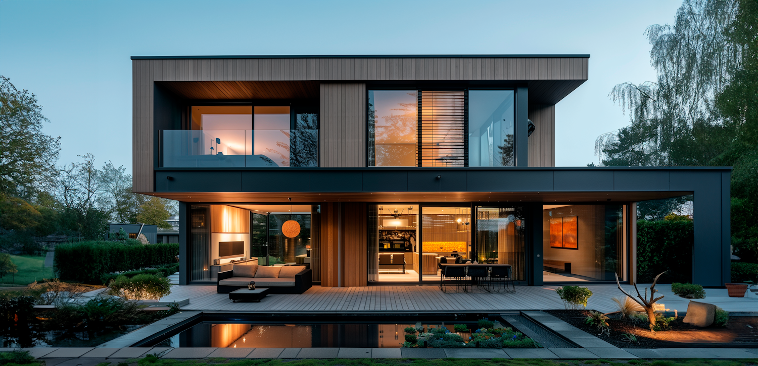 Modern two-story house with wood and metal design, large glass windows, landscaped garden, and serene pond reflecting warm lighting.