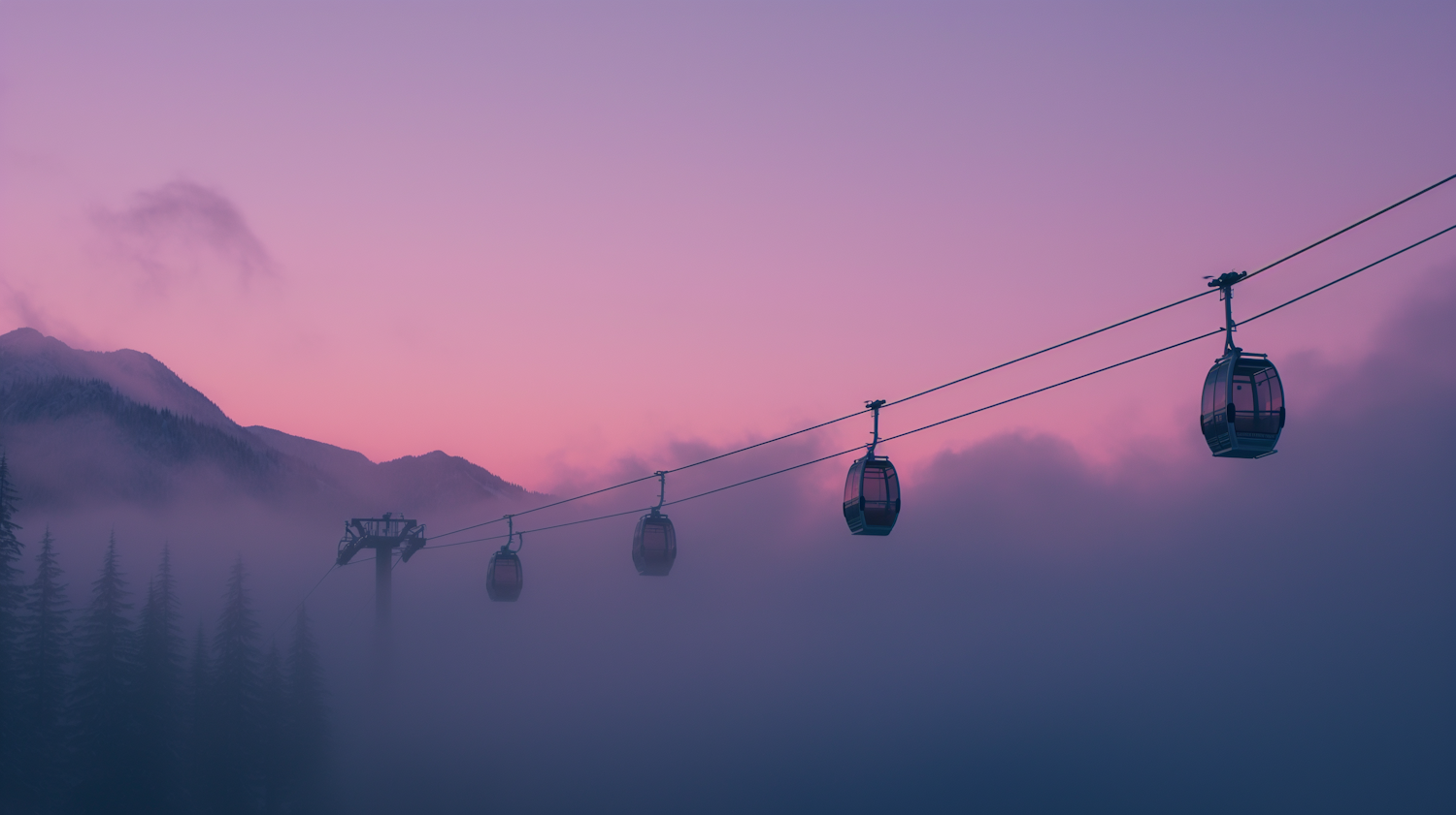 Cable cars glide through misty mountains at dawn, with a pink and purple sky creating a serene and ethereal atmosphere.