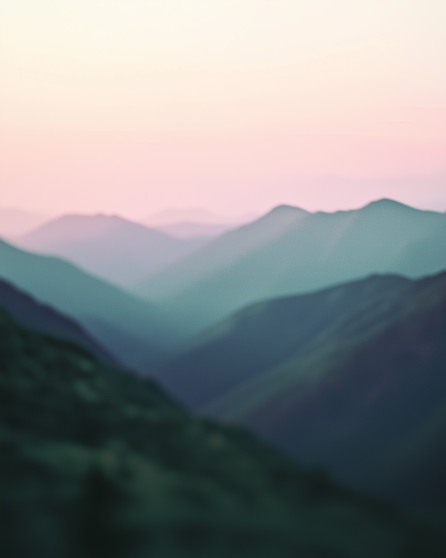 Dreamy twilight mountain landscape with pastel skies and misty green peaks, creating a serene and tranquil atmosphere.
