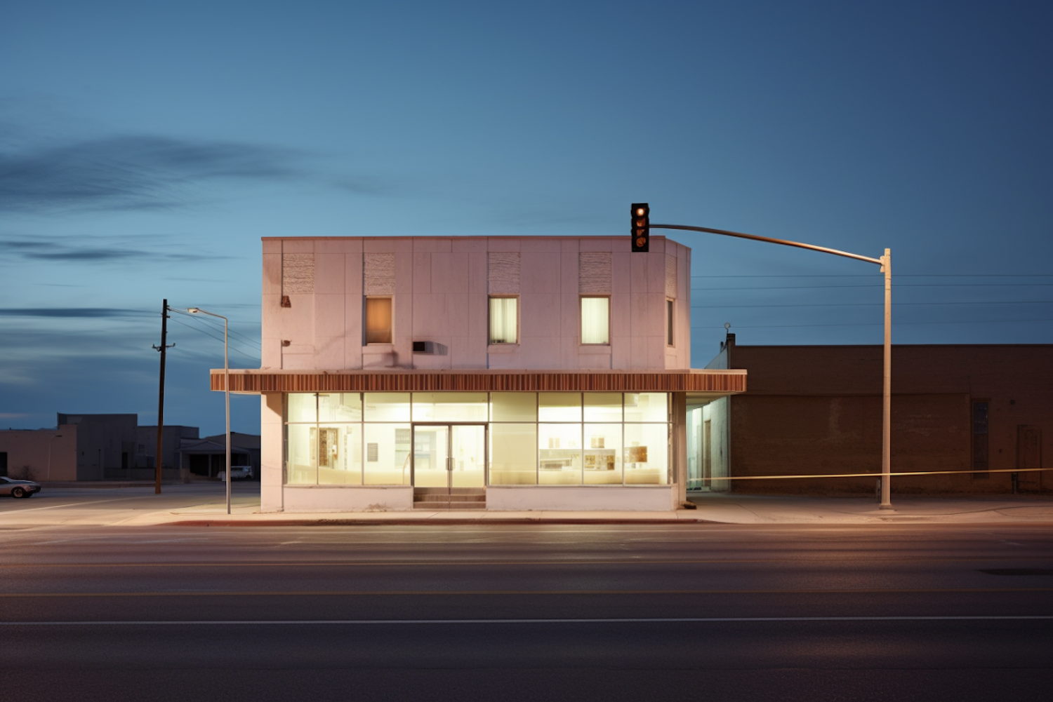 A minimalist two-story building at twilight, with glowing windows and a quiet street, under a deep blue evening sky.