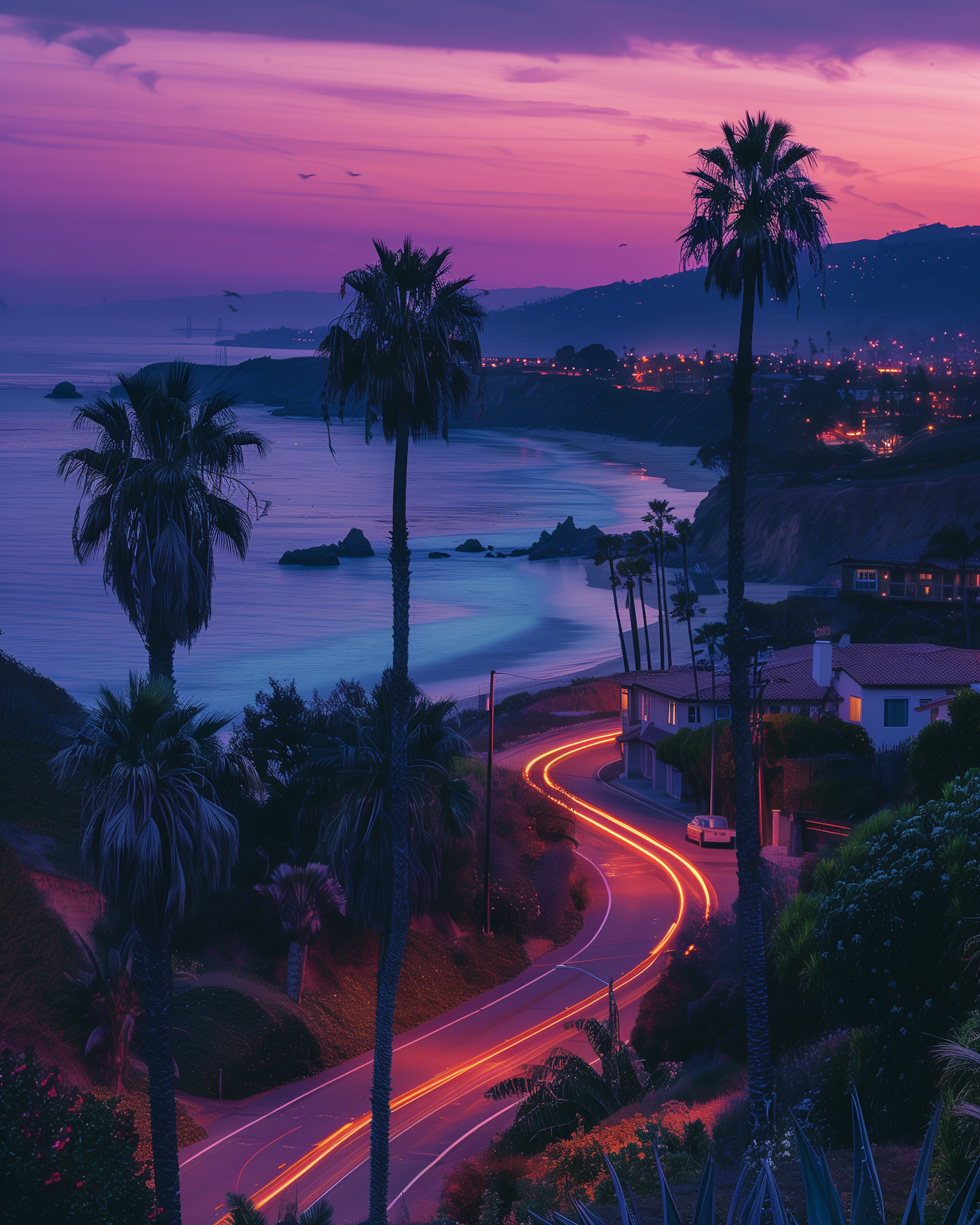 Dusk coastal scene with palm trees, vibrant sky, and glowing car light trails on a winding road by the ocean.