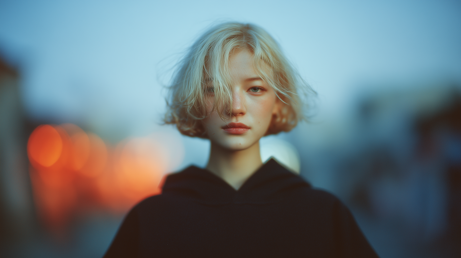 A person with short blonde hair in a dark hoodie stands against a twilight background with warm bokeh lights and a cool blue sky.