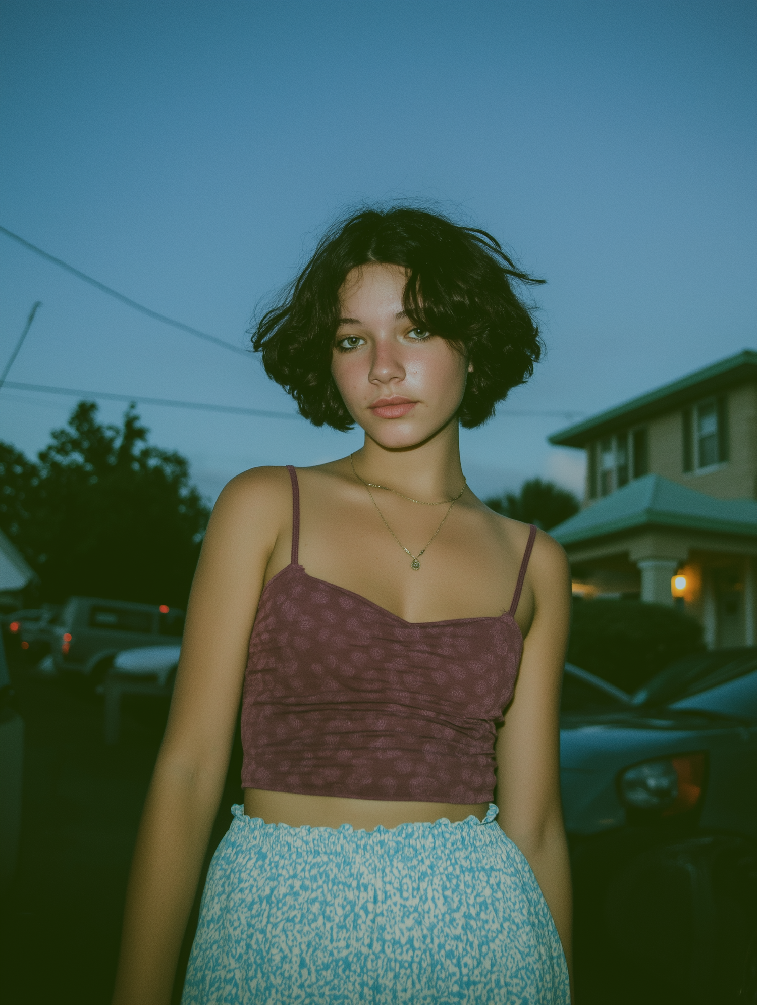 A young woman in a maroon top and blue pants poses outdoors at twilight, with a suburban house and cars in the background.