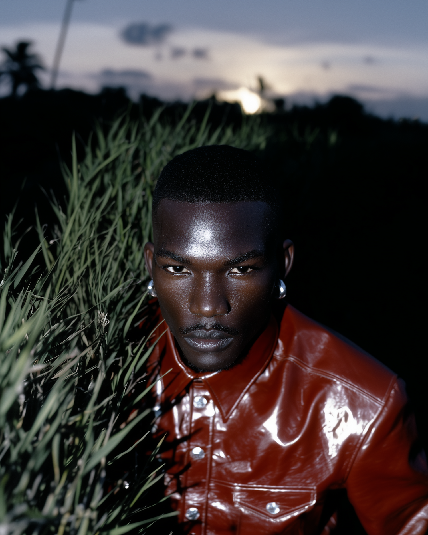 Stylish individual in a glossy red jacket amidst tall grass, with a dramatic twilight backdrop and a serene natural vibe.