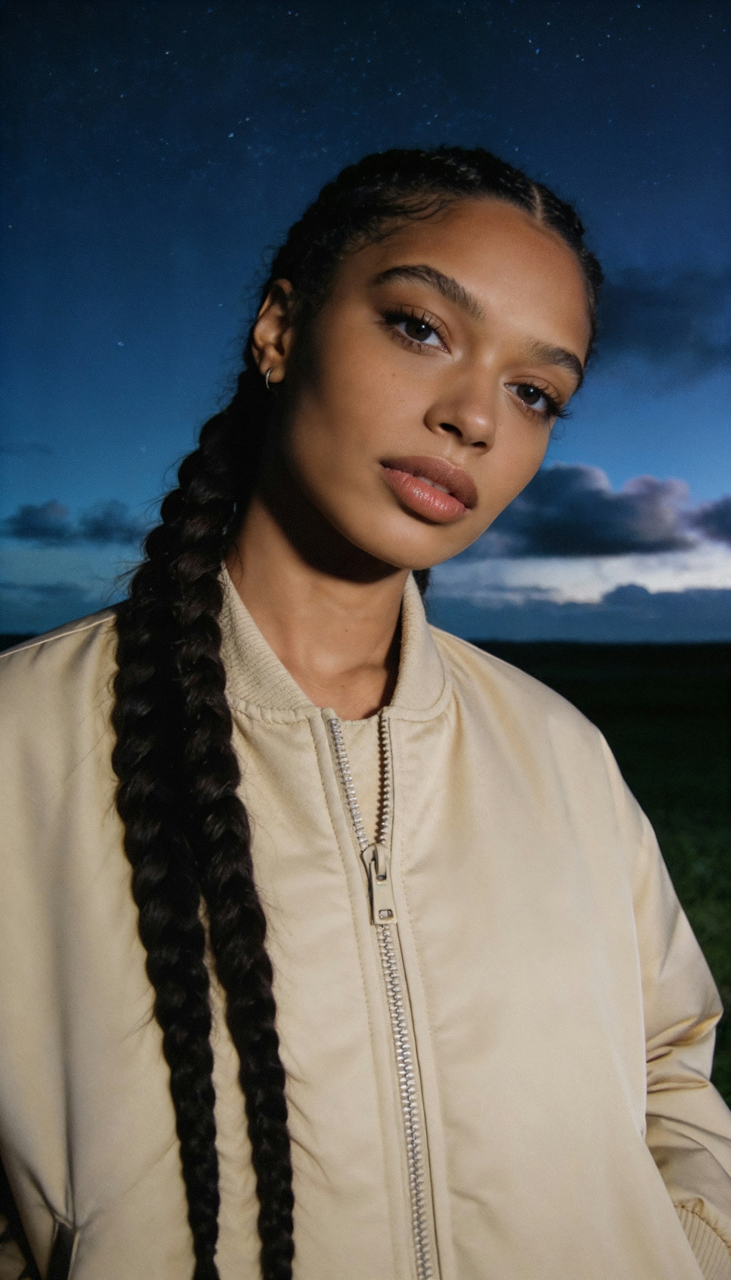 A serene portrait of a woman with braided hair and a beige jacket, set against a twilight sky with scattered clouds.