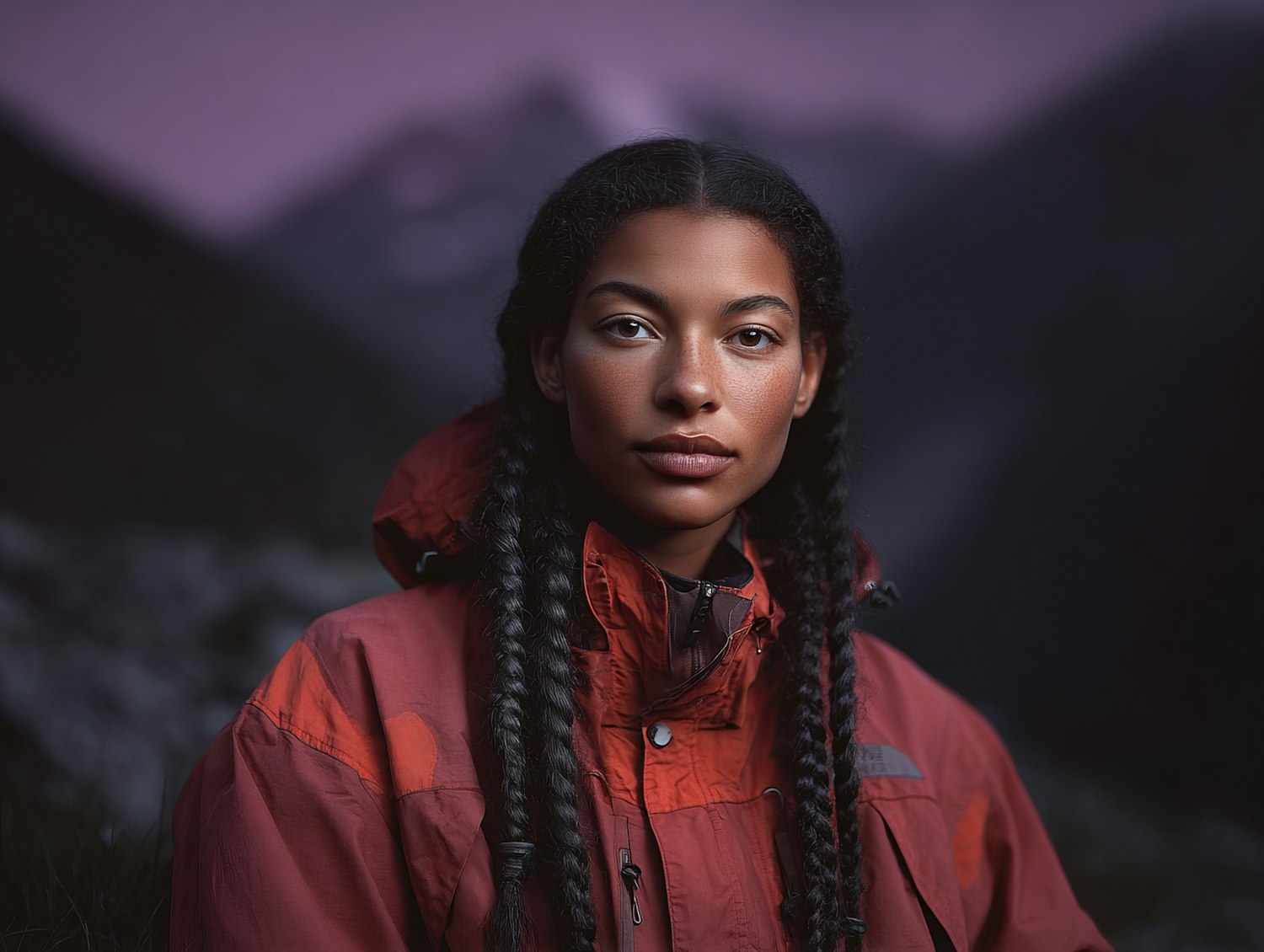 A serene portrait of a woman in a red jacket against a twilight mountain backdrop, showcasing natural beauty and tranquility.