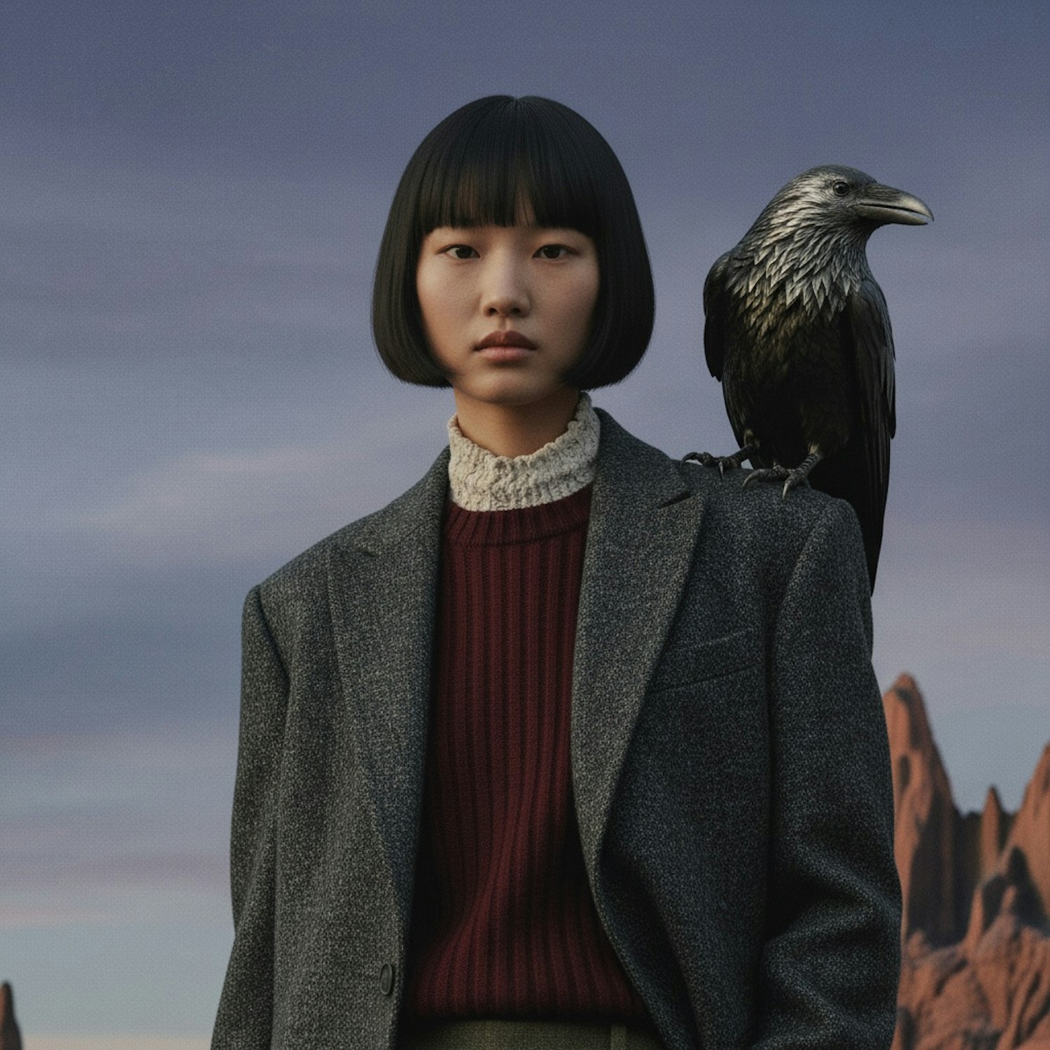 A serene portrait of a woman with a raven perched on her shoulder, set against a twilight landscape with muted tones and rugged terrain.