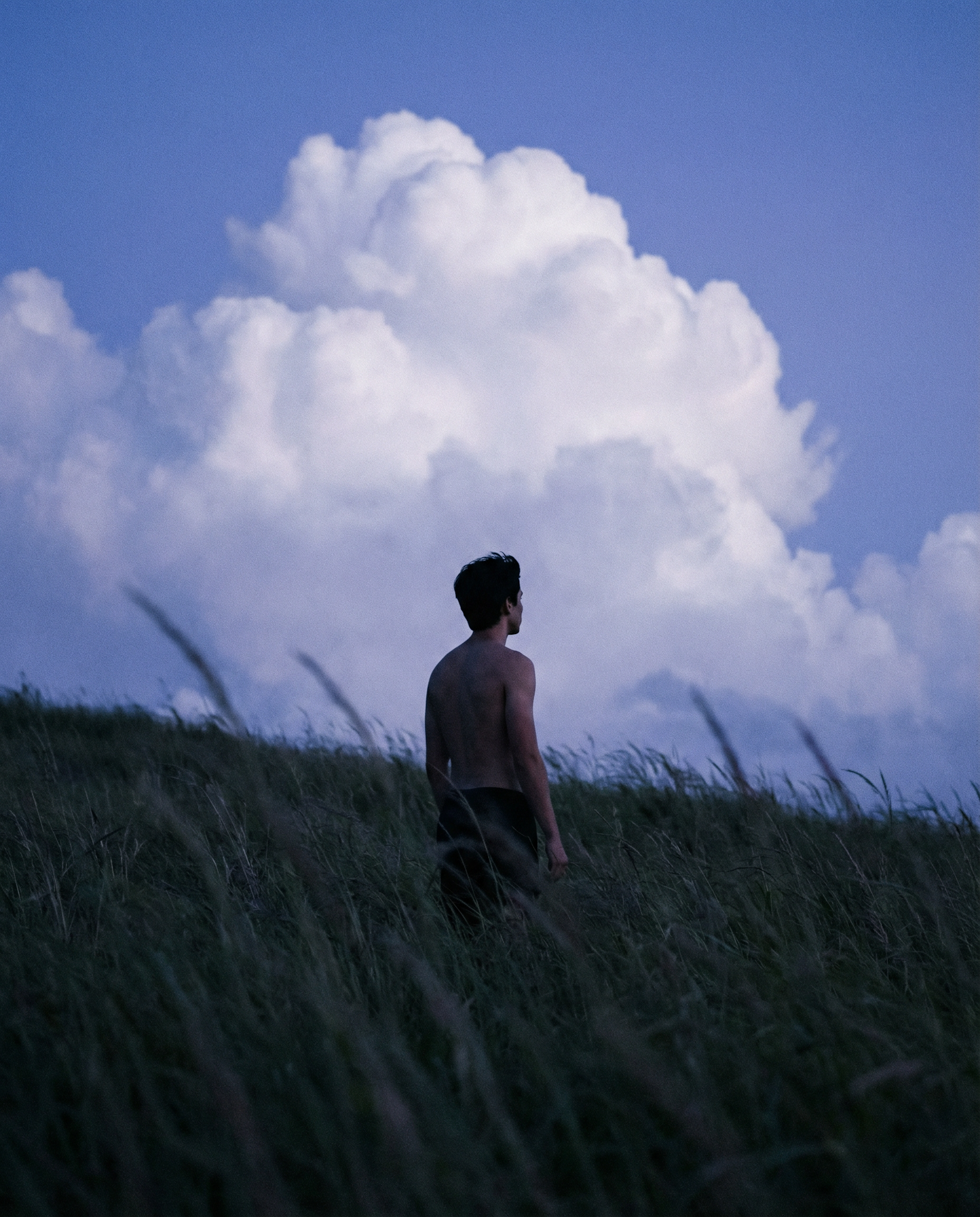 A person stands in a grassy field under a twilight sky, gazing at a large cloud formation, creating a serene and contemplative scene.