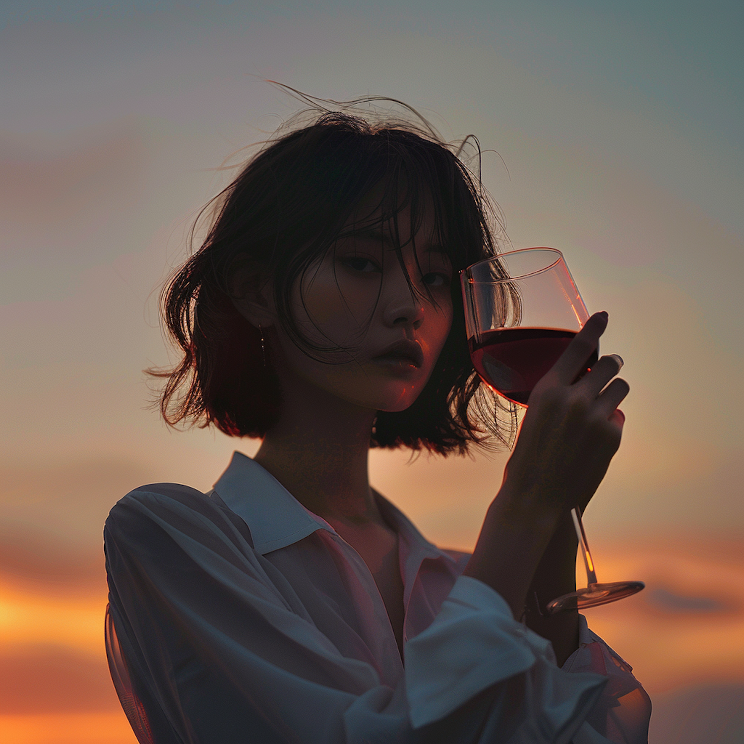A contemplative woman holding a glass of red wine against a vibrant sunset, wearing a white blouse with warm, serene lighting.
