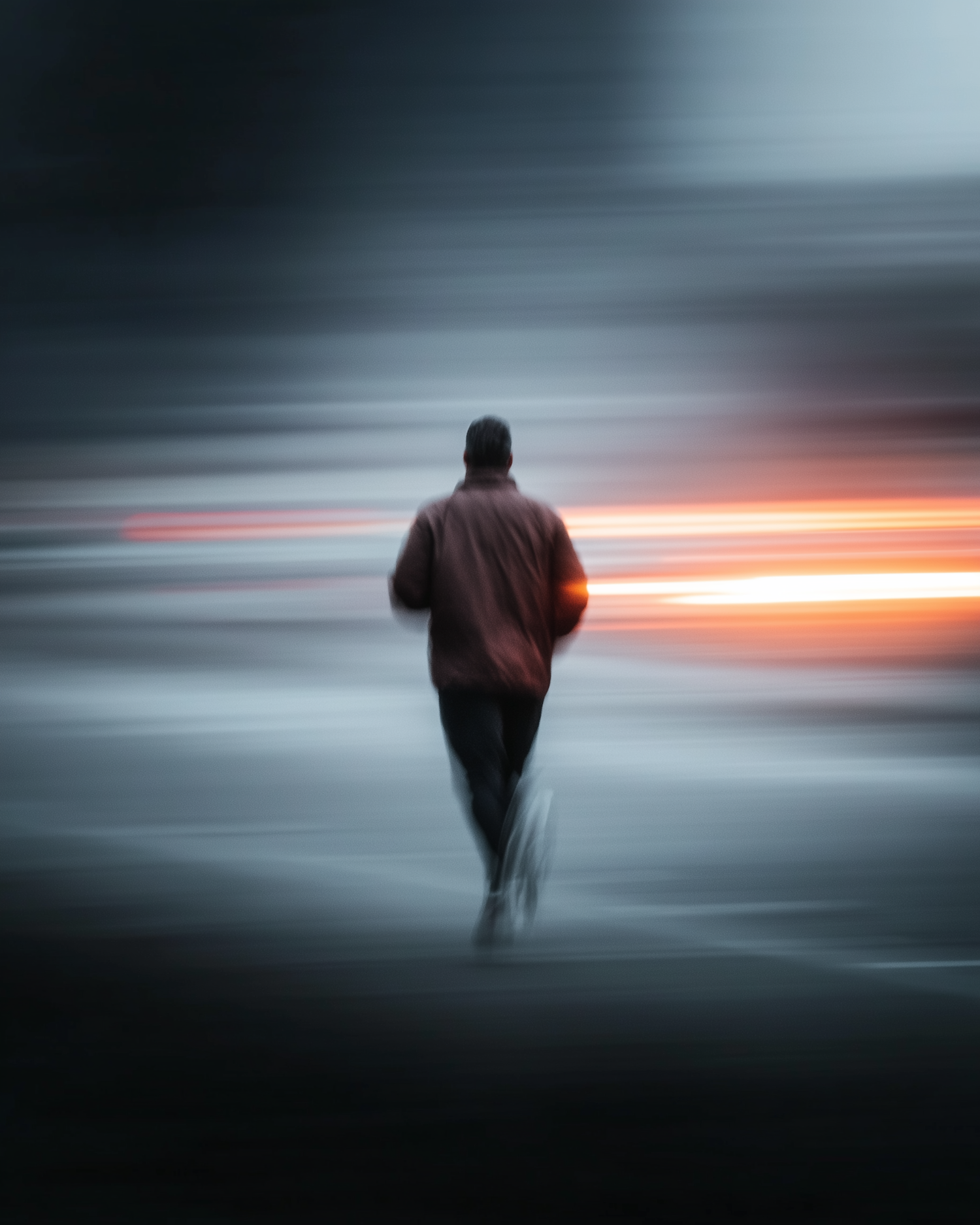A runner in motion on a blurred street with streaks of orange light, creating a dynamic and energetic scene.