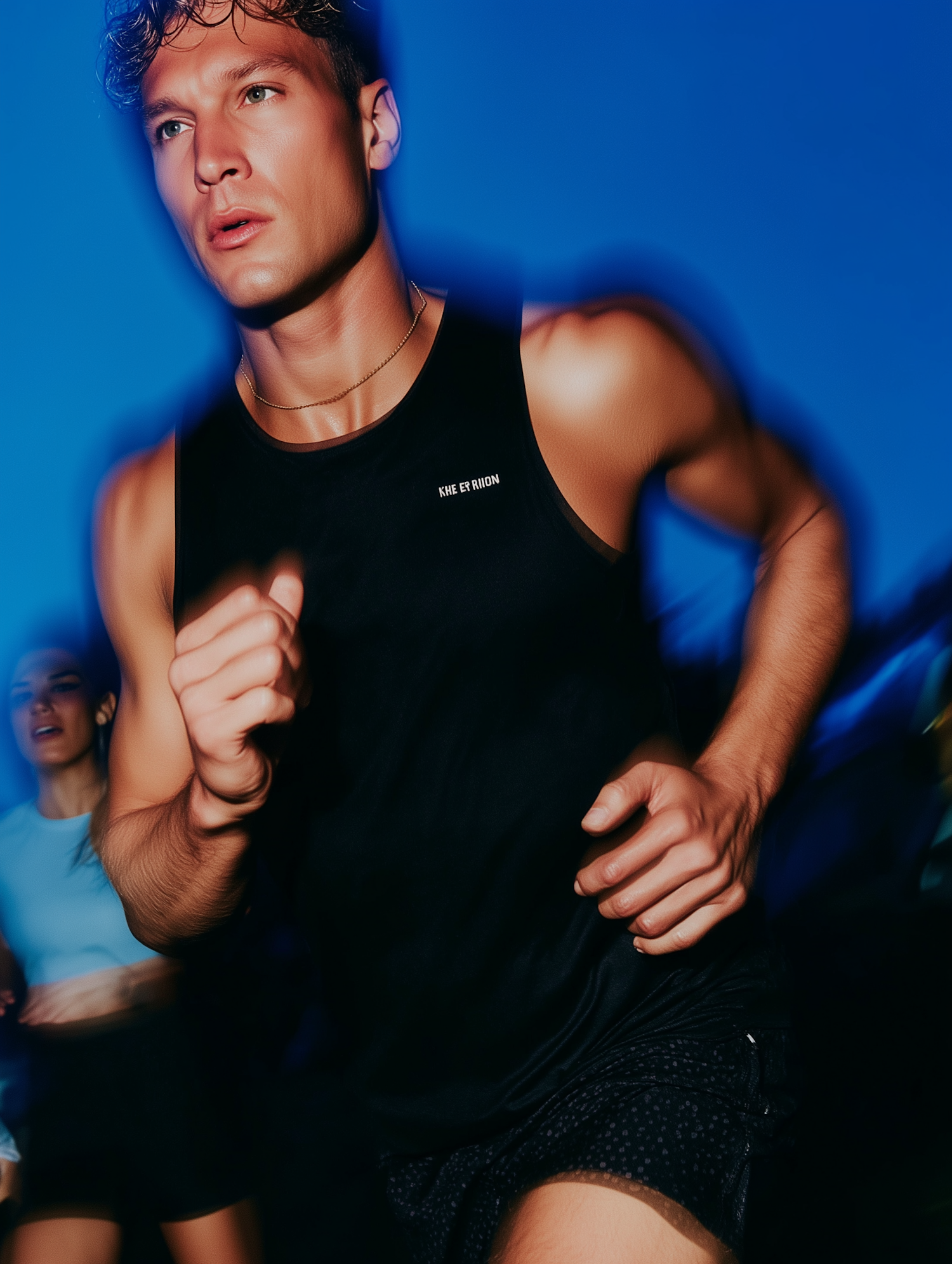 Focused man running outdoors at twilight in athletic gear, with a woman in the background, set against a vibrant blue sky.