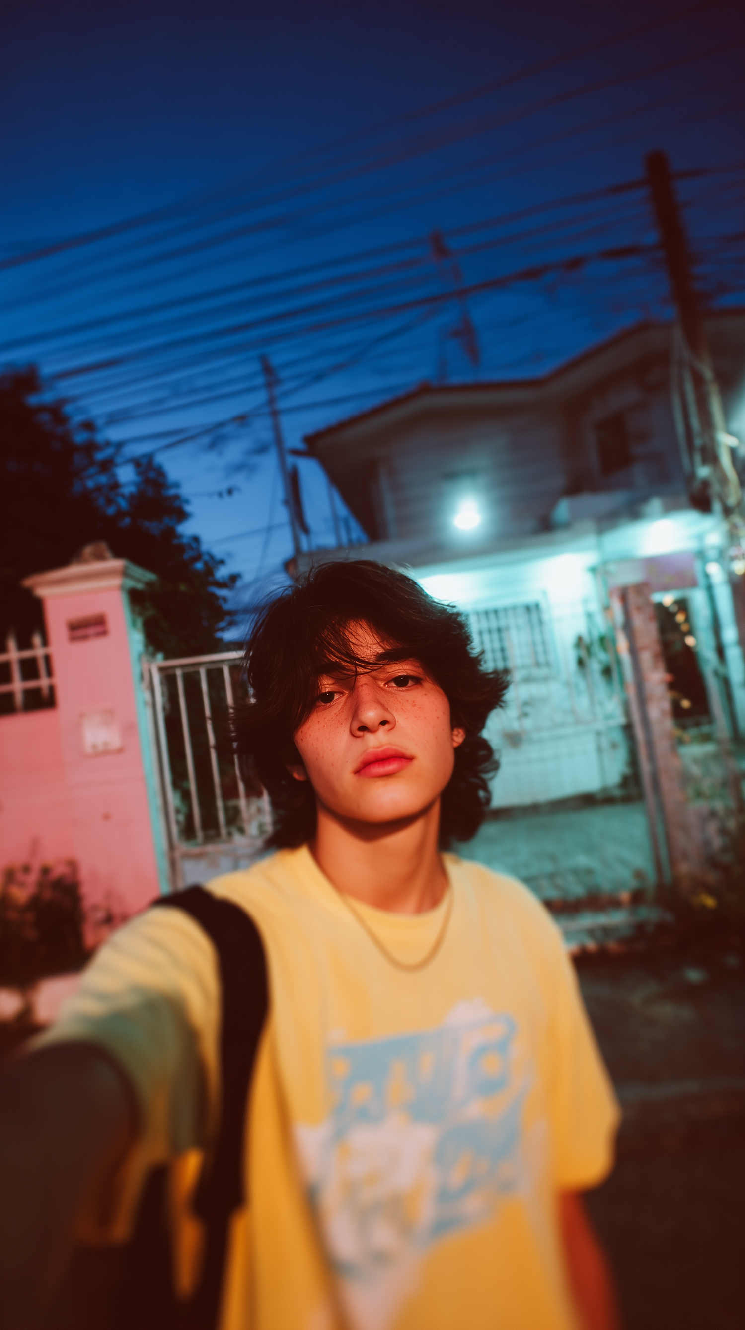 A young person in a yellow shirt takes a selfie at twilight, with a house and fence in the background under warm and cool lighting.