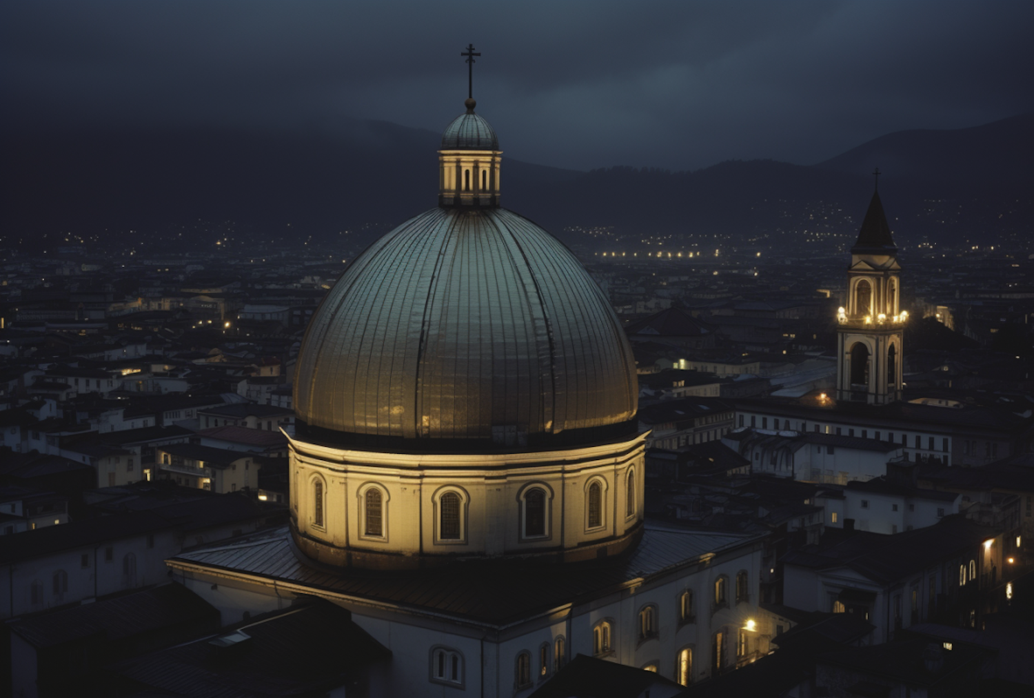 Illuminated dome and bell tower against a night sky, creating a serene and mysterious cityscape.