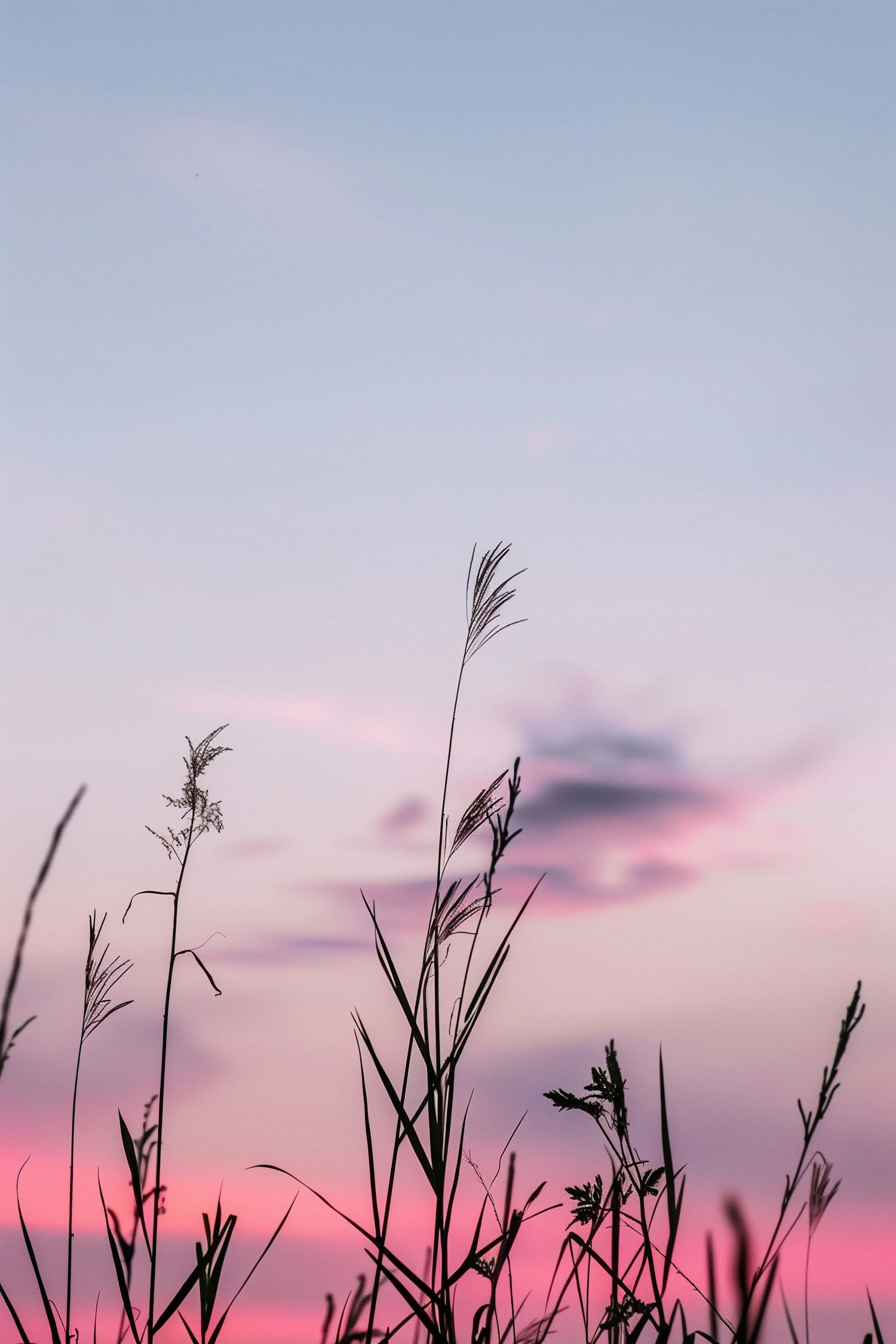 Silhouetted grass against a pink and blue sky, capturing a tranquil sunset or sunrise scene with wispy clouds.