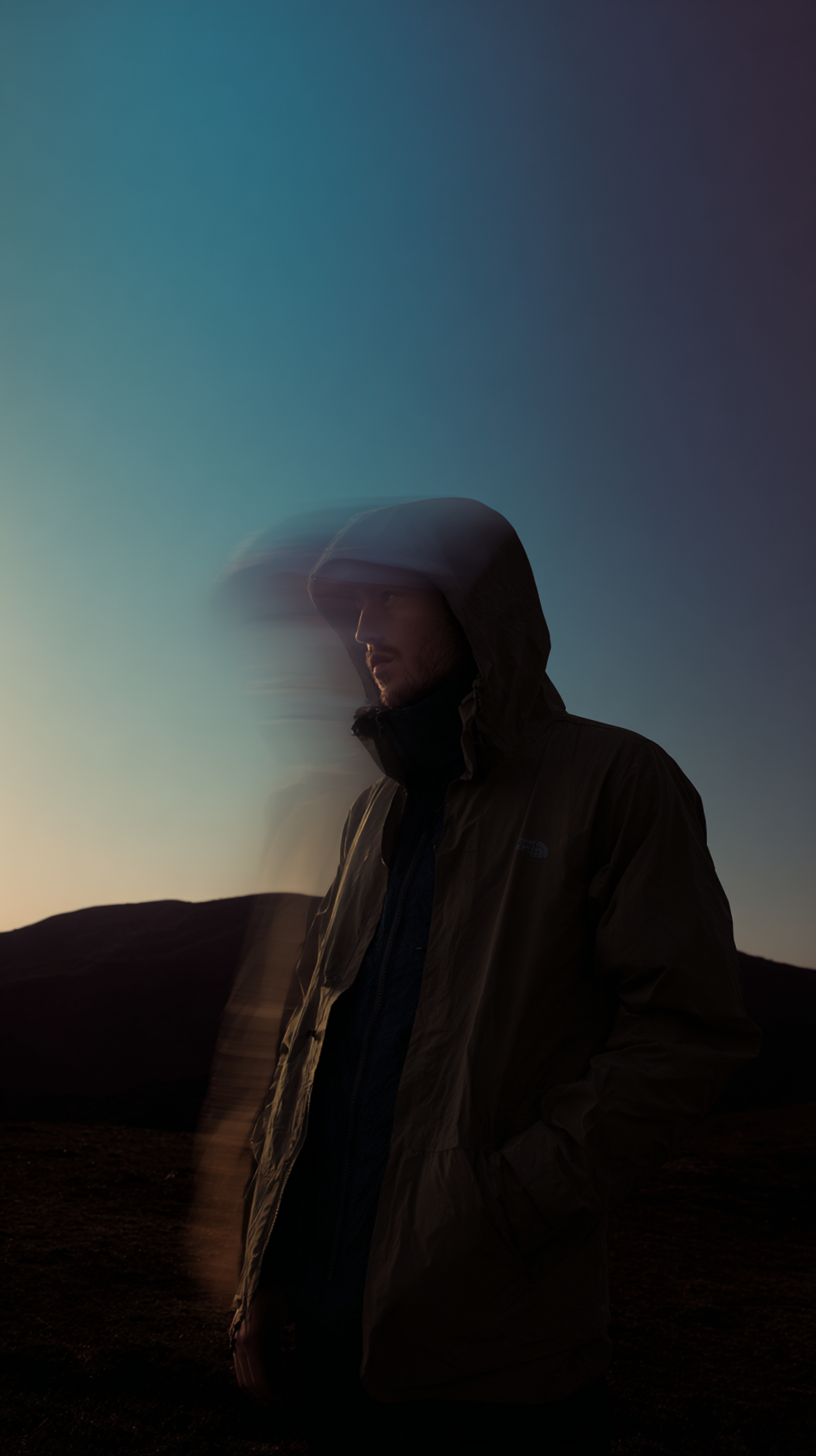 A person in a hooded jacket stands at twilight with a blurred motion effect, set against a gradient sky and silhouetted hills.
