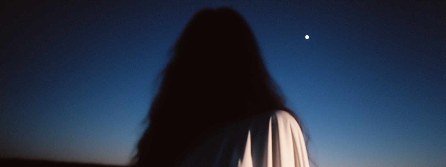 A silhouette of a person under a twilight sky with the moon visible, creating a serene and mysterious atmosphere.