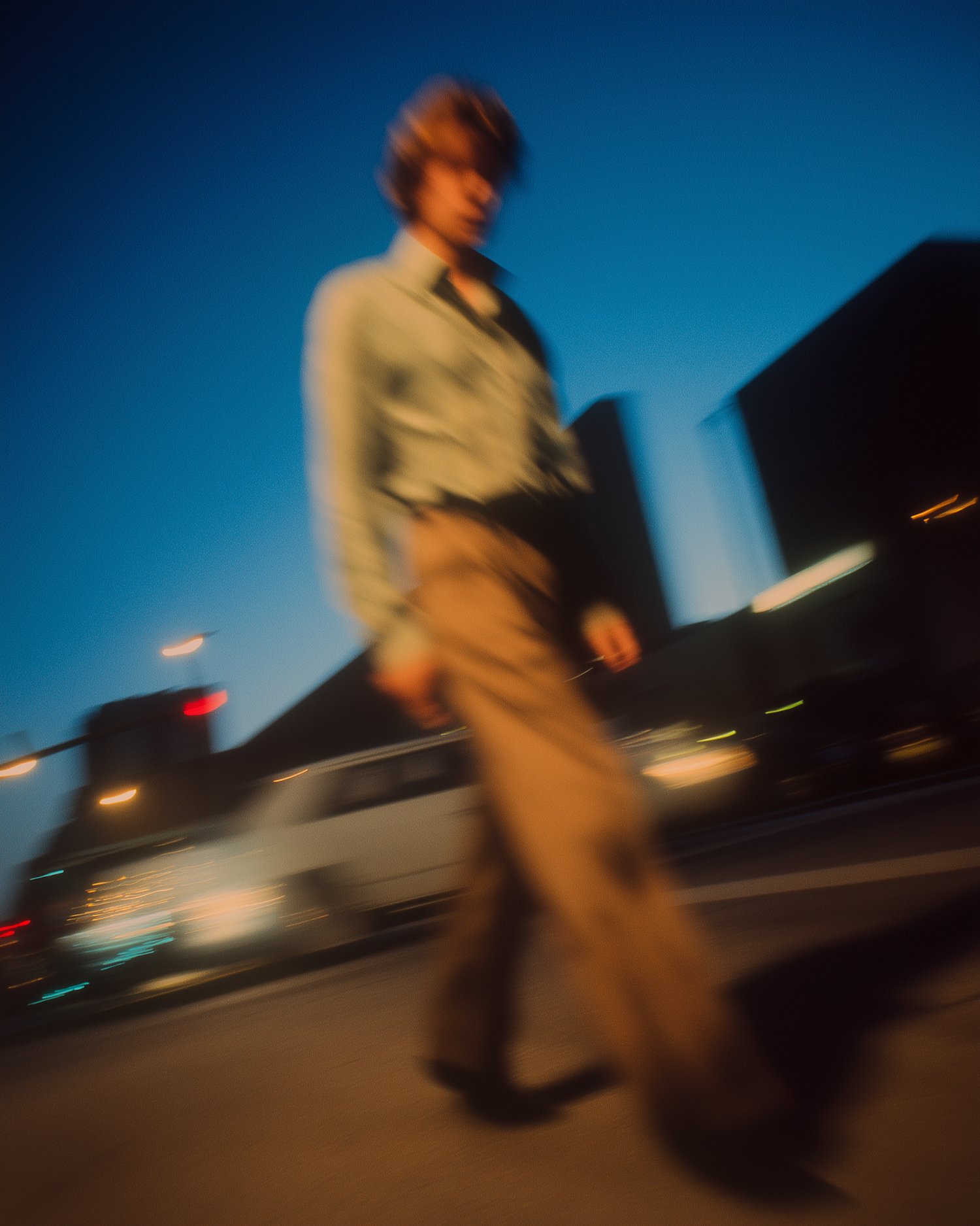 Blurred motion shot of a person walking in a city at twilight, with a deep blue sky and glowing vehicle lights in the background.