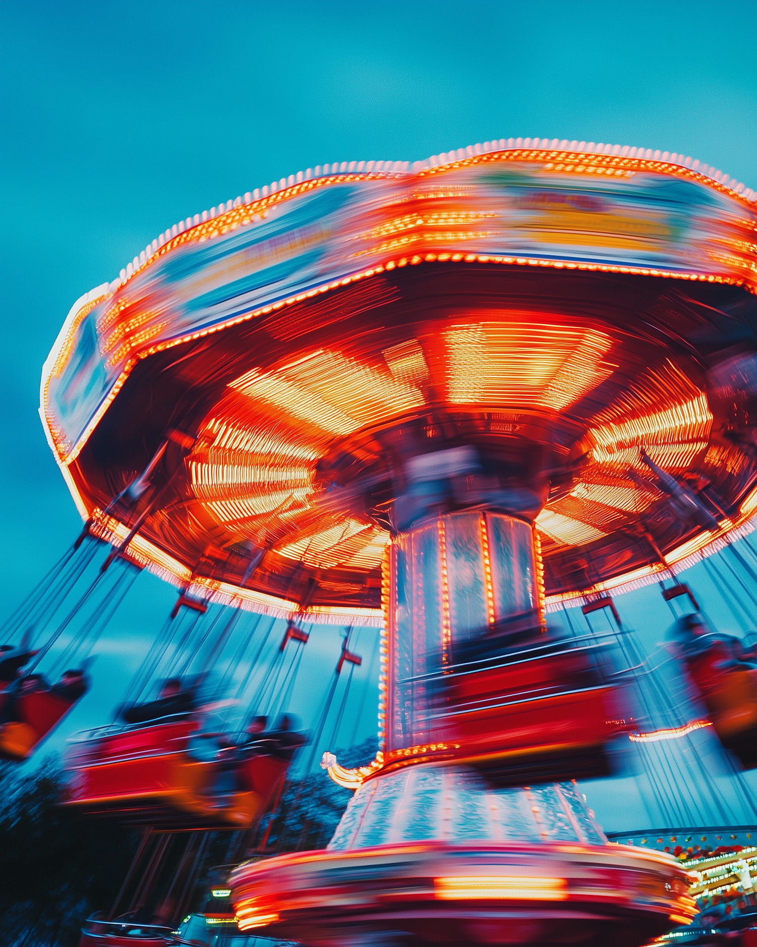 A spinning swing carousel glowing with warm lights against a twilight sky, capturing the thrill and motion of an amusement park ride.