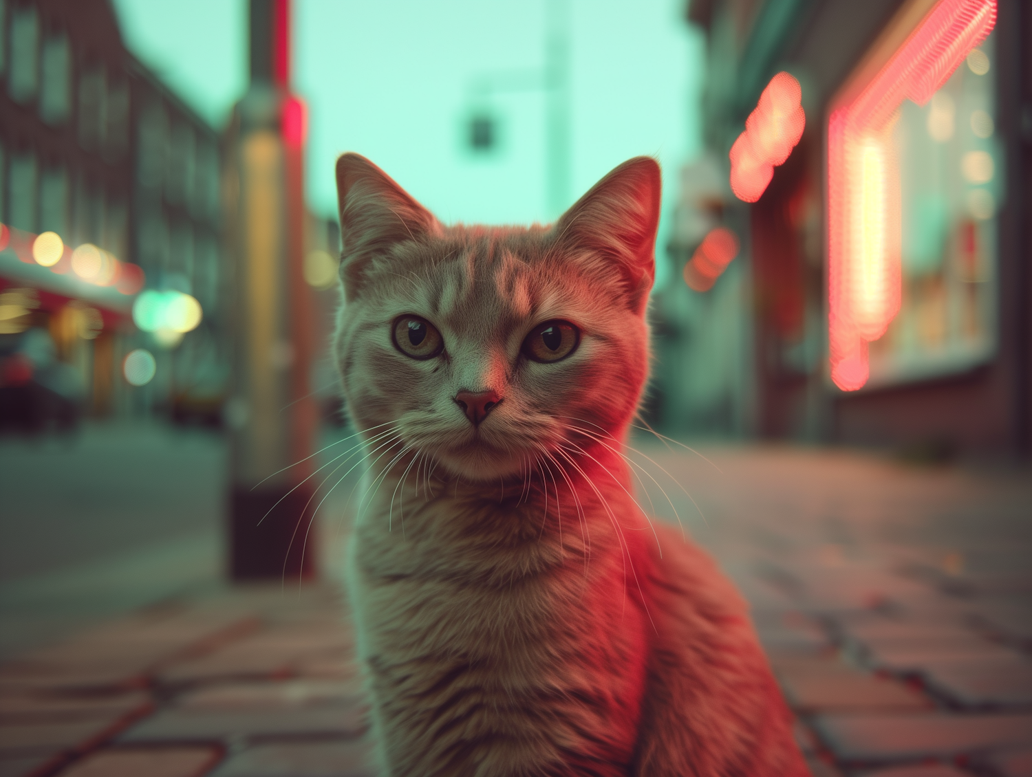 Ginger cat with green eyes sits on a cobblestone street, illuminated by neon lights, creating a vibrant urban atmosphere.