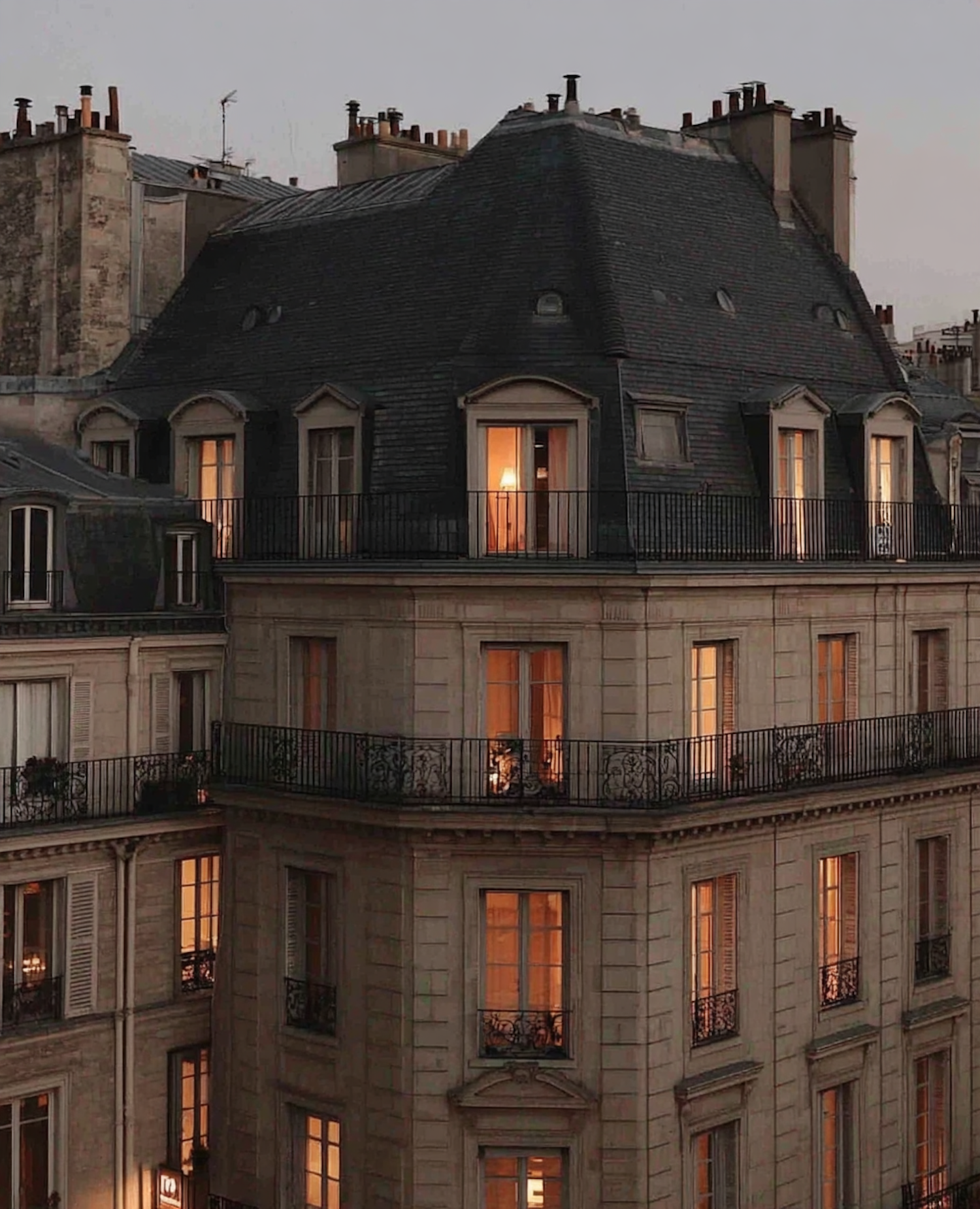 A cozy European building at dusk, with warm lights glowing from windows and intricate architectural details.
