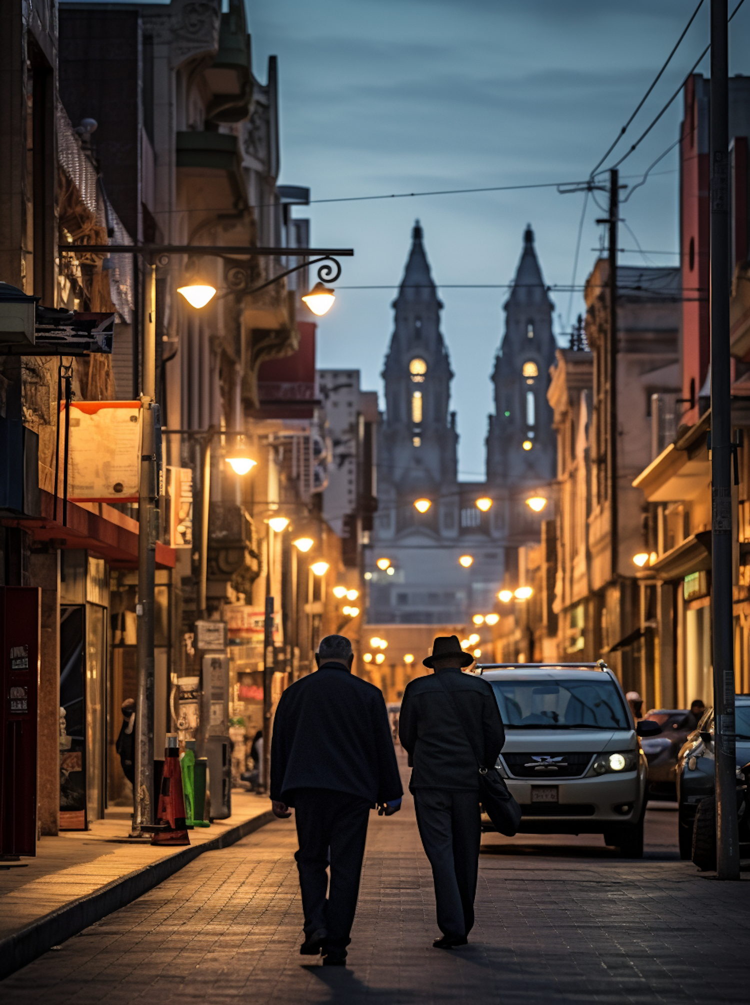 Two men walk down a dimly lit street with a cathedral in the background, creating a serene urban evening scene.