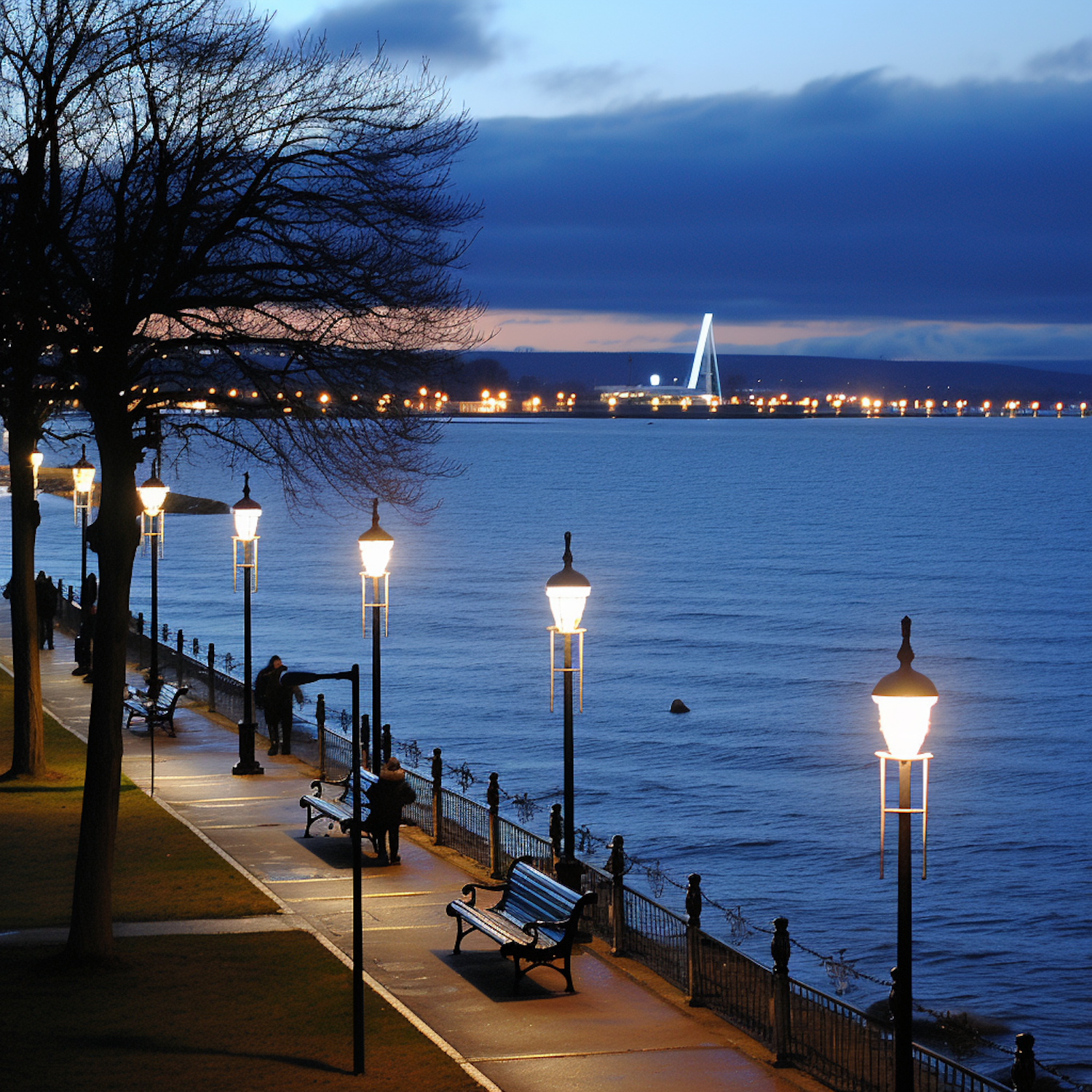 Dusk at a waterfront promenade with vintage lamps, benches, and a view of a modern illuminated bridge over calm waters.