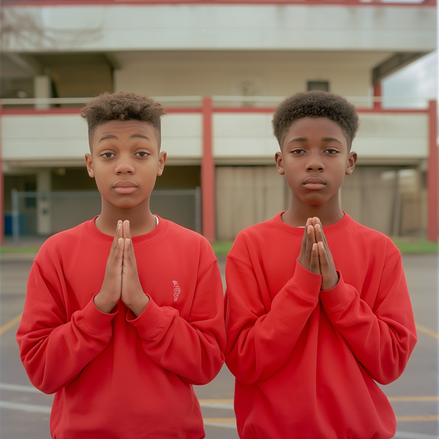 Two young boys in red sweatshirts stand with hands in prayer, looking directly at the camera. Background features a building.