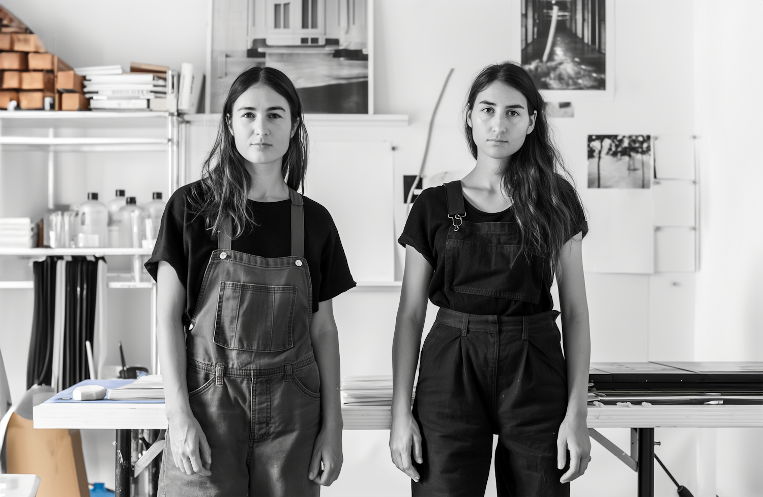 Two women in a monochromatic studio, wearing black tops and overalls, surrounded by art and books, with a modern, artistic vibe.