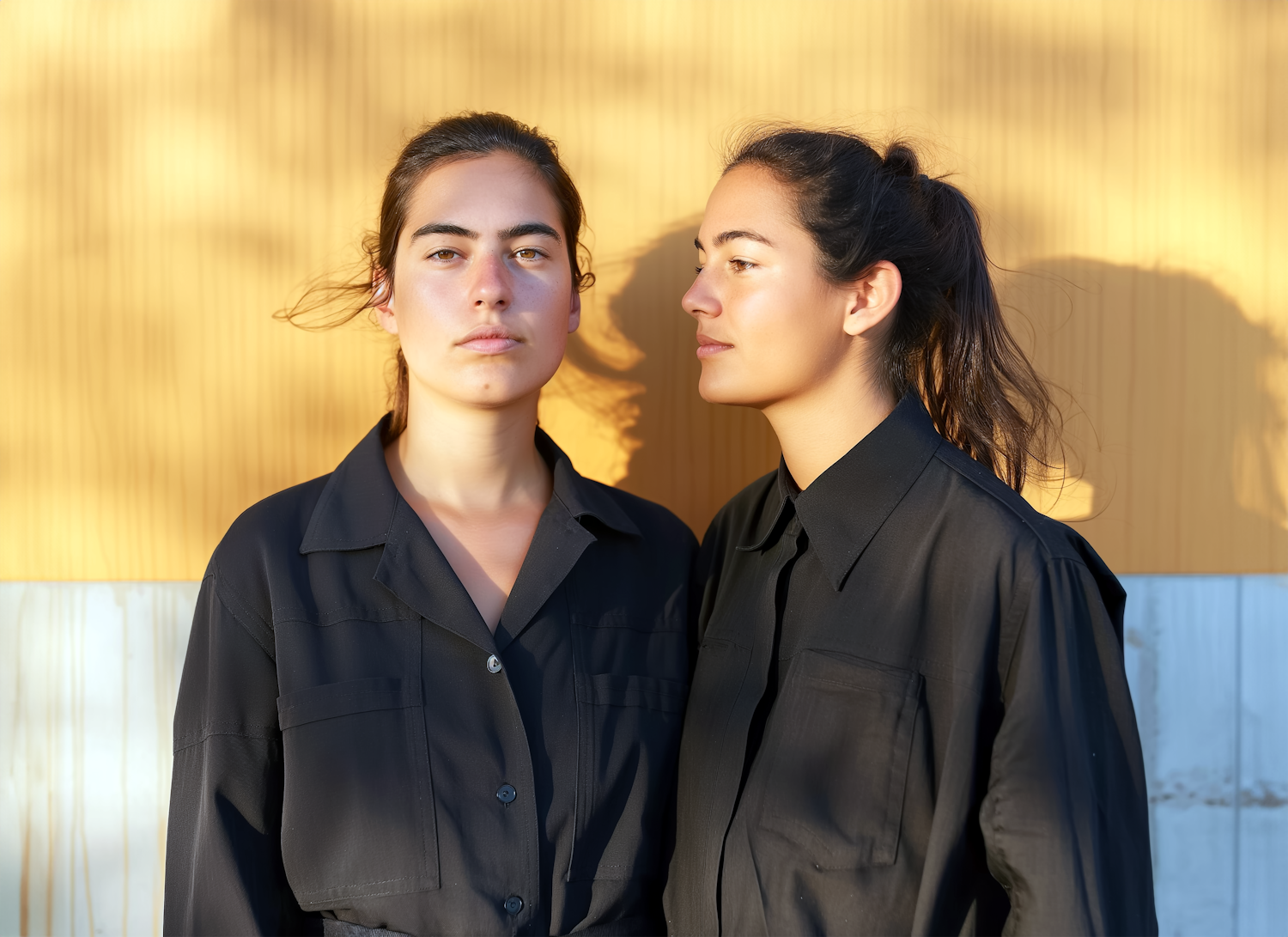 Two women in black shirts stand against a sunlit yellow background, one looking at the camera, the other gazing sideways.