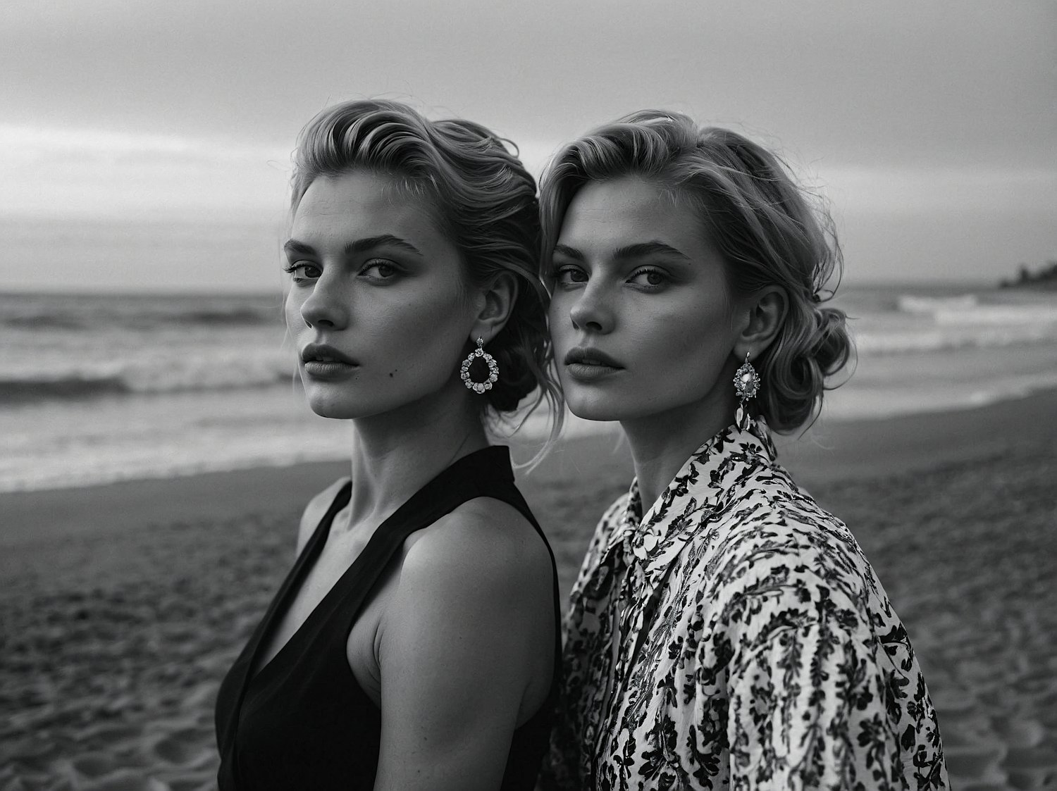 Two blonde women with elegant earrings pose on a beach, exuding a serene and dramatic vibe against a cloudy sky and calm sea.