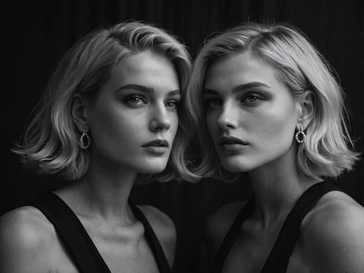 Two women with short blonde hair and elegant earrings pose closely together against a dark background.
