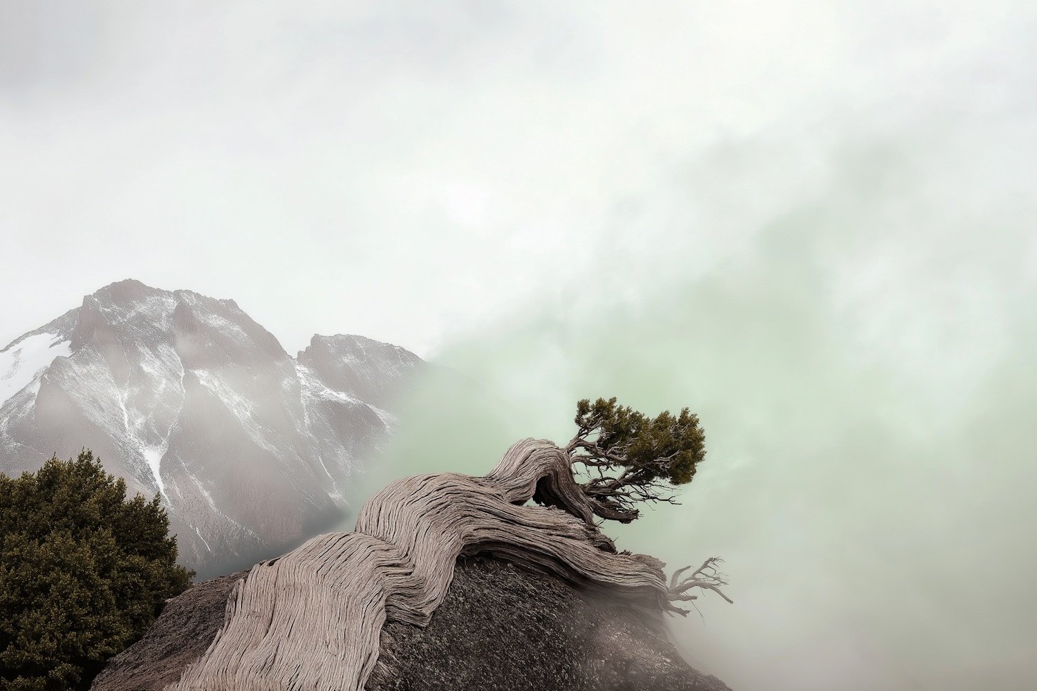 Twisted tree on rugged rock with misty mountains in the background. A serene yet dramatic nature scene with earthy tones and soft mist.
