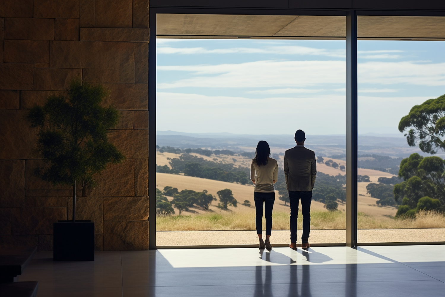 A couple stands by a large window, admiring a scenic landscape of rolling fields and trees under a clear sky.