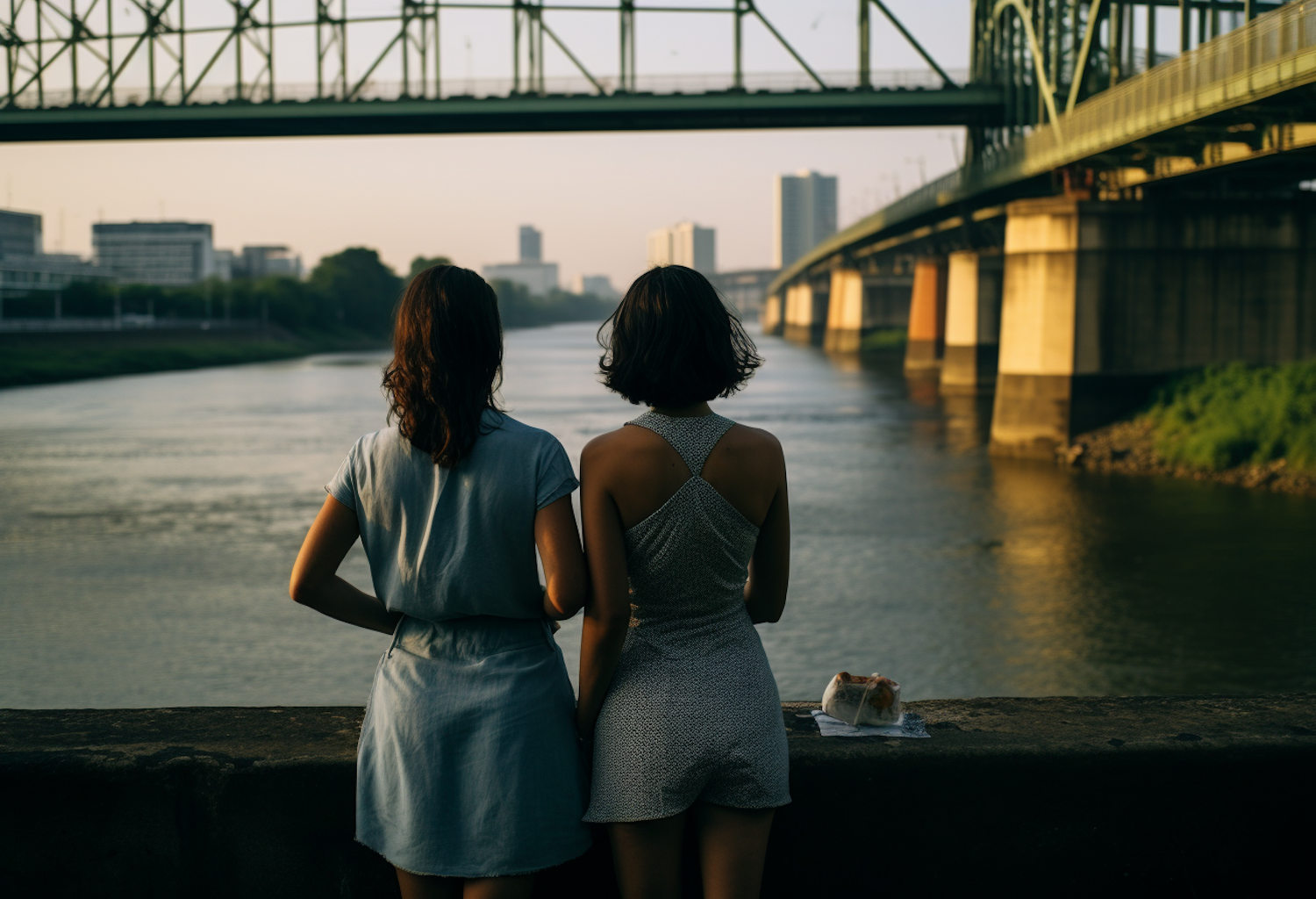 Two women stand by a river at sunset, gazing at the water with a bridge and cityscape in the background.