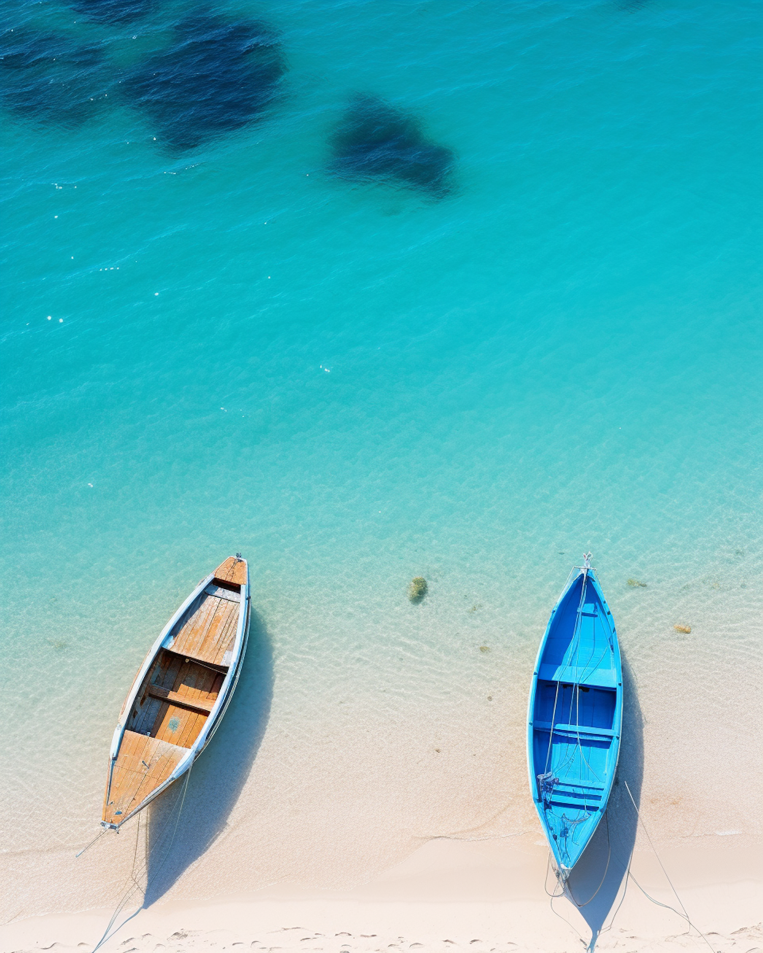 Two boats on a sandy beach with clear turquoise water, one wooden and one blue, creating a serene coastal scene.