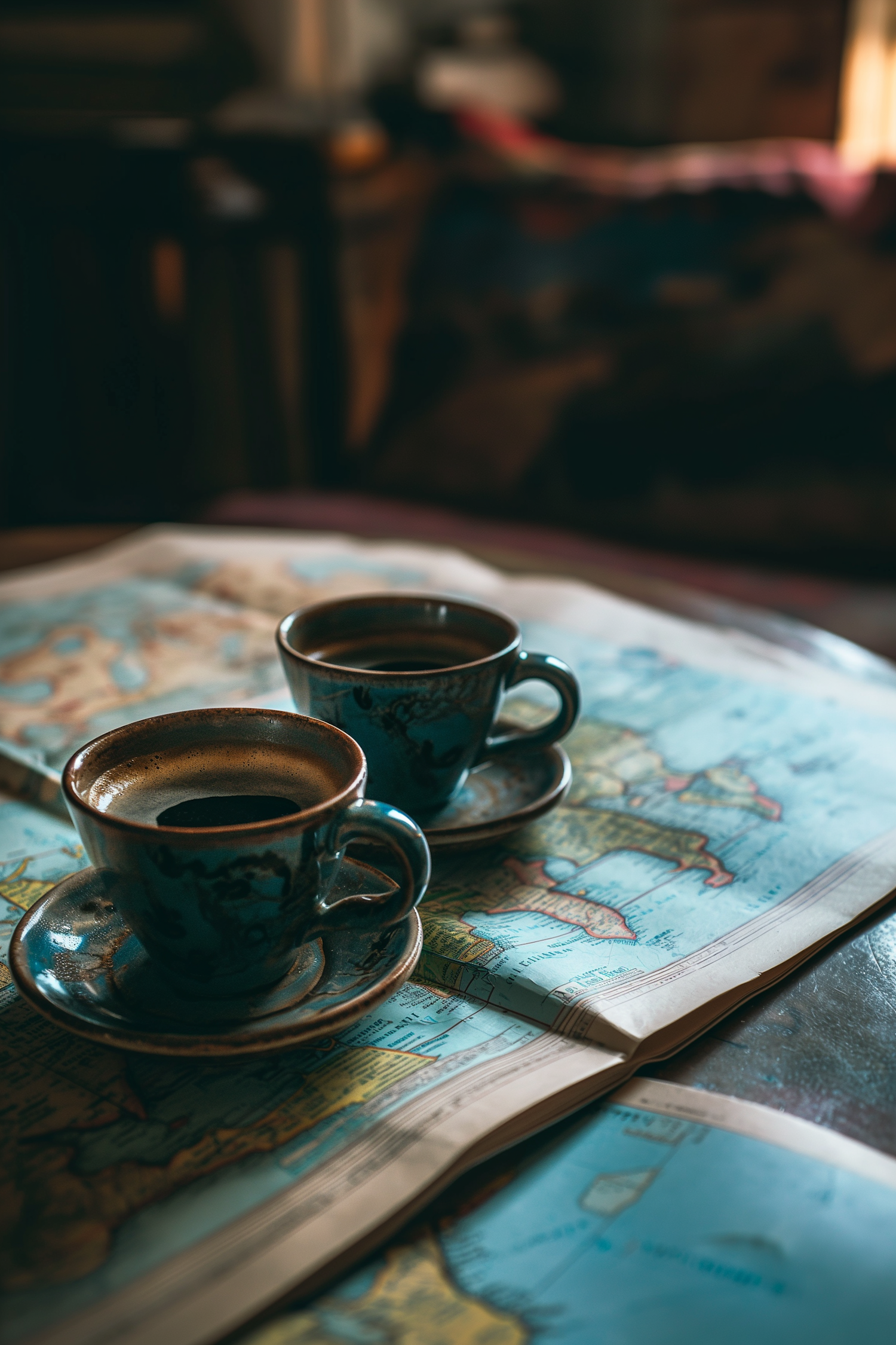 Two blue ceramic coffee cups on a detailed map, creating a cozy travel-themed setting with warm lighting.