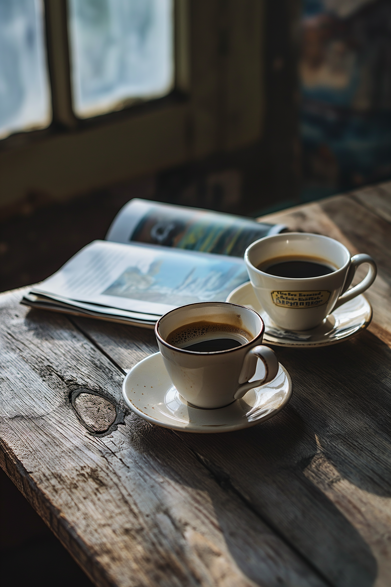 Two cups of black coffee on a rustic wooden table with sunlight and an open magazine, creating a cozy, relaxed atmosphere.