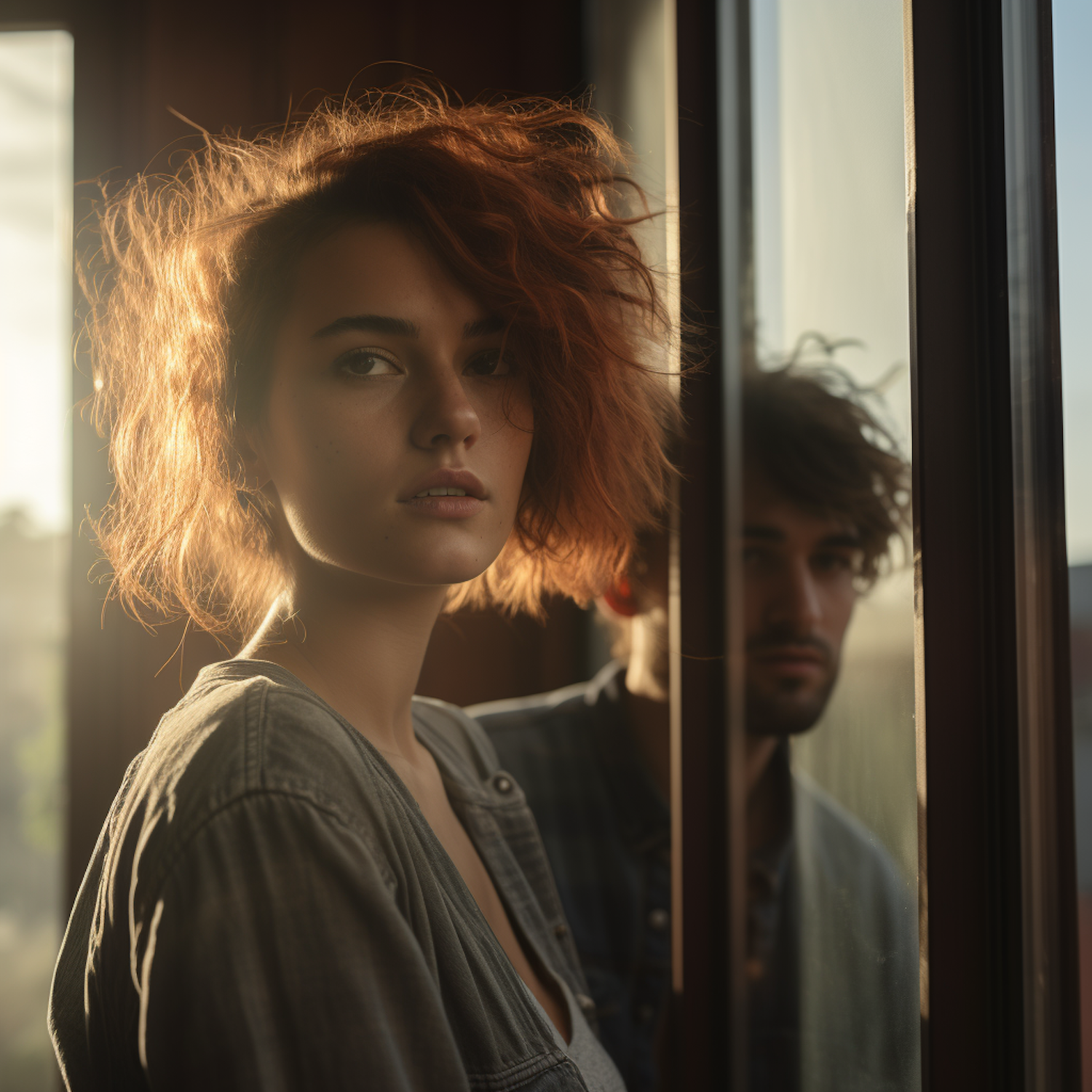 A young woman with red hair and a contemplative gaze stands by a window, with a man partially visible in the background.