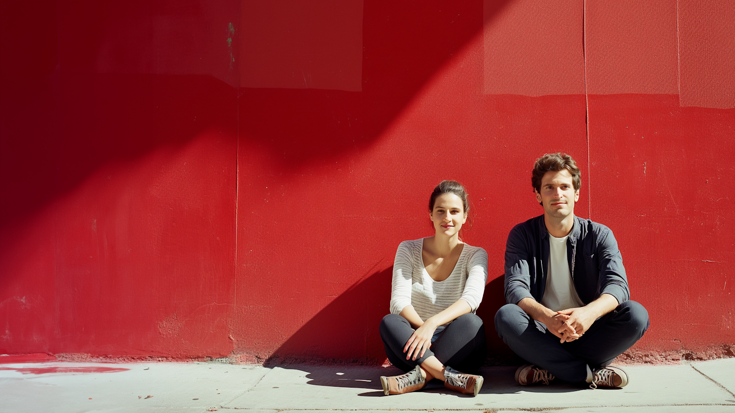 Young couple sitting against a vibrant red wall, enjoying a sunny day. Casual attire and relaxed expressions create a serene urban vibe.